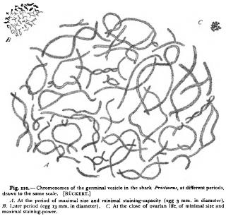 stances, from those richest in albumin to those poorest in it, or containing none, assume the tone of the nuclear (i.e. basic) stain, but the combined albumin modifies the green more or less towards Lilienfeld explains the fact that chromatin in the cell-nucleus seldom appears pure green on the assumption, supported by many facts, that the proportion of nucleic acid and albumin vary with different physiological conditions, and he suggests further that the intense staining-power of the chromosomes during mitosis is probably due to the fact that they consist, like the chromatin of spermatozoa, of pure or nearly pure nucleic acid. Very interesting and convincing is a comparison of the foregoing staining-reactions with those given by a mixture of a red basic dye (saffranin) and a green acid one (" light green "). With this combination an effect is given which reverses that of the Biondi-Ehrlich mixture ; i.e. the nuclein is coloured' red, the albumin green. This is a beautiful demonstration of the fact that staining-reagents cannot be logically classified according to colour, but only according to their chemical nature. Such terms as " erythrophilous," " cyanophilous," and the like have therefore no meaning apart from the chemical composition both of the dye and of the substance stained.' The constancy and accuracy of these reactions await further test, and until this has been carried out we should be careful not to place too implicit a trust in the staining-reactions as an indication of chemical nature, especially as they are known to be affected by the preceding mode of fixation. They afford, nevertheless, a rough method for the micro-chemical test of the proportion of nucleic acid present in the nuclear structures, and this in the hands of Heidenhain has led to some suggestive results. Leucocytes stained with the BiondiEhrlich mixture of acid fuchsin and methyl-green show the following reactions. Cytoplasm, centrosome, attraction-sphere, astral rays, and spindle-fibres are stained pure red. The nuclear substance shows a very sharp differentiation. The chromatic network and the chromosomes of the mitotic figure are green. The linin-substance and the true nucleoli or plasmosomes appear red, like the cytoplasm. The linin-network of leucocytes is stated by Heidenhain to consist of two elements, namely, of red granules or microsomes suspended in a colourless network. The latter alone is called " linin " by Heidenhain. To the red granules is applied the term " oxychromatin," while the green substance of the ordinary chromatic network, forming the " chromatin " of Flemming, is called " basichromatin." 2 Morphologically, the granules of both kinds are exactly and in many cases the oxychromatin-granules are found not only in the "achromatic " nuclear network, but also intermingled with the basichromatin-granules of the chromatic network. Collating these results with those of the physiological chemists, Heidenhain concludes that basichromatin is a substance rich in phosphorus (i.e. nucleic acid), oxychromatin a substance poor in phosphorus, and that, further, " basichromatin and oxychromatin are by no means to be regarded as permanent unchangeable bodies, but may change their colour-reactions by combining with or giving off phosphorus." In other words, " the affinity of the chromatophilous microsomes of the nuclear network for basic and acid aniline dyes are regulated by certain physiological conditions of the nucleus or of the cell." 4 This conclusion, which is entirely in harmony with the statements of Kossel and Halliburton quoted above, opens up the most interesting questions regarding the periodic changes in the nucleus. The staining-power of chromatin is at a maximum when in the preparatory stages of mitosis (spireme-thread, chromosomes). During the ensuing growth of the nucleus it always diminishes, suggesting that a combination with albumin has taken place. This is illustrated in a very striking way by the history of the egg-nucleus or germinal vesicle, which exhibits the nuclear changes on a large scale. It has long been known that the chromatin of this nucleus undergoes great changes during the growth of the egg, and several observers have maintained its entire disappearance at one period. Ruckert first carefully traced out the history of the chromatin in detail in the eggs of sharks, and his general results have since been confirmed by Born in the eggs of Triton. In the shark Pristiurus Ruckert ('92, i) finds that the chromosomes, which persist throughout the entire growth-period of the egg, undergo the following changes (Fig. 110) : At a very early stage they are small, and stain intensely with nuclear dyes. During the growth of the egg they undergo a great increase in size, and progressively lose their staining-capacity. At the same time their surface is enormously increased by the development of long threads which grow out in every direction from the central axis (Fig. 110, A) . As the egg approaches its full size, the chromosomes rapidly diminish in size, the radiating threads disappear, and the staining-capacity increases (Fig. I to, B) . They are finally again reduced to minute intensely staining bodies which enter into the equatorial plate of the first polar mitotic figure (Fig. no, C). How great the change of volume is may be seen from the following figures. At the beginning the chromosomes measure, at most, 12 (about 1/2000 in.) in length and p. in diameter. At the height of their development they are almost eight times their original length and twenty times their original diameter. In the final period they are but 2 z in length and 1 u in diameter. These measurements show a change of volume so enormous, even after making due allowance for the loose structure of the large chromosomes, that it cannot be accounted for by mere swelling or shrinkage. The chromosomes evidently absorb a large amount of matter, combine with it to form a substance of diminished stainingcapacity, and fin