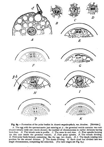 To Butschli ('76,) Hertwig, and Giard ('77) we owe the discovery that the formation of the polar bodies is through mitotic division, the chromosomes of the equatorial plate being derived from the chromatin of the germinal vesicle.' In the formation of the first polar