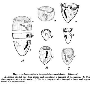 found that Stentor may by shaking be broken into fragments of all sizes, and that nucleated fragments as small as A- the volume of the entire animal are still capable of complete regeneration. All non-nucleated fragments perish.