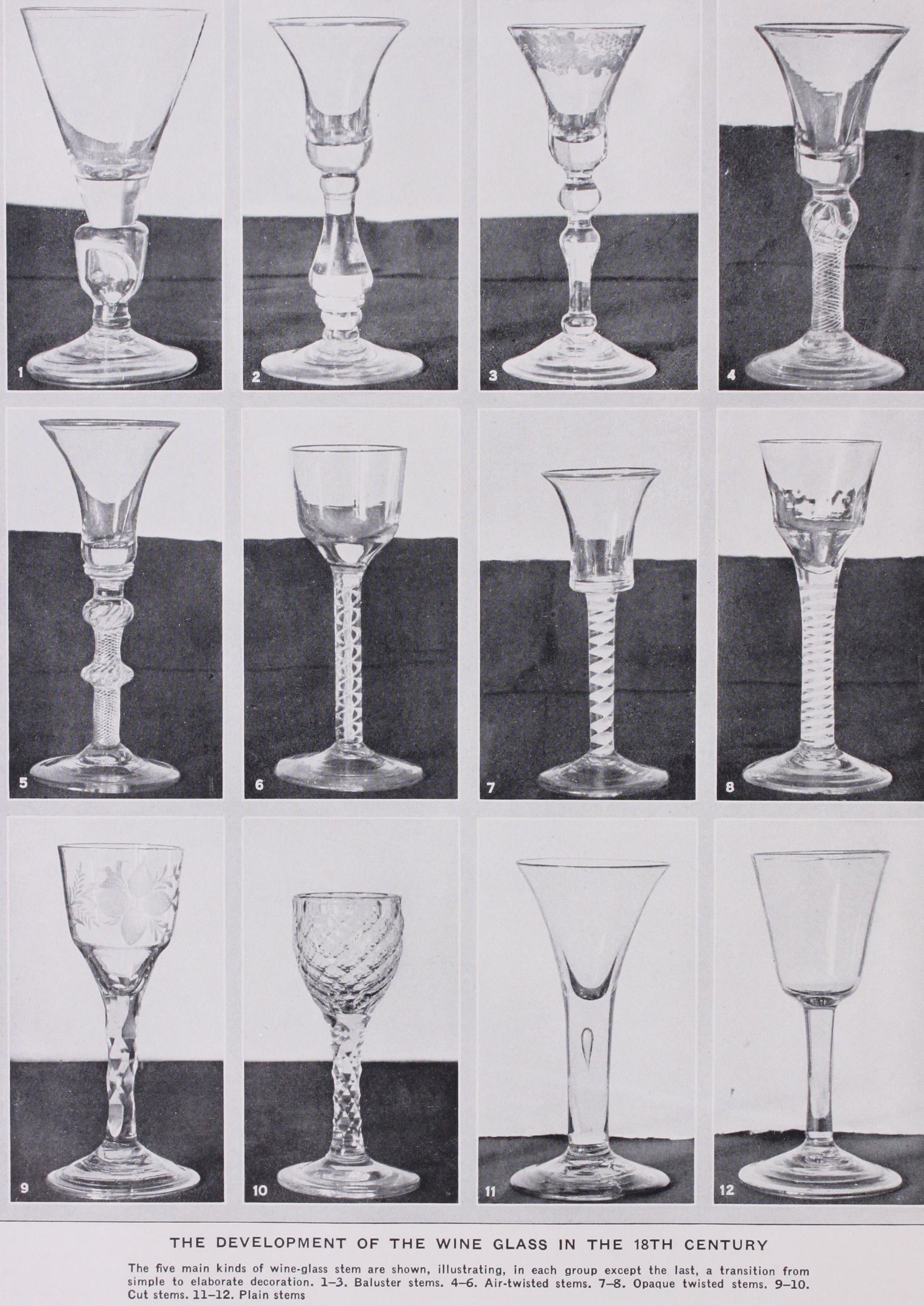 Drinking-glasses with the air-twisted stem were in fashion in England from about 1735 to 176o, and in Ireland till somewhat later. An air-twist in the stem was made originally by inserting a number of large air bubbles in the thickened base of a partly formed bowl and then drawing down the bowl into a stem and at the same time twisting the stem; the air bubbles were thus contracted and formed into corkscrew air-lines within the stem. At first the result was a coarse, irregular spiral (Plate XIII., fig.