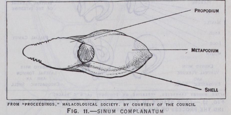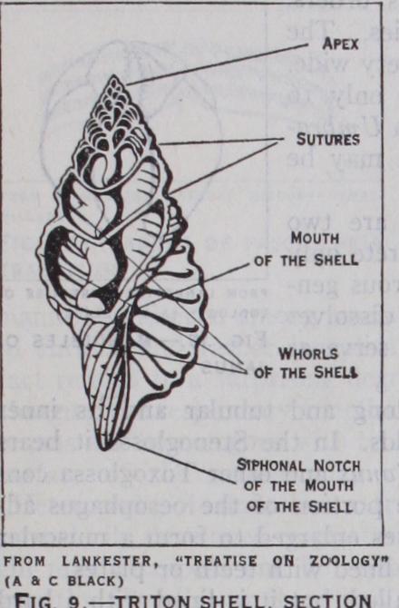 In the most archaic representatives of the class, however (e.g. Bellerophon, among the extinct Cambrian genera and Pleuroto maria among living- forms) the shell is coiled. It is worthy of note that in Bellerophon the shell is not of an elongate or screw like spiral shape, its coils being all in one plane (planospiral), like that of the primitive cephalopod Nautilus. The modifications of the adult shell are complex and manifold. The general plan and the terminology employed in describing shells are shown in fig. 9 and the various modifications are described and illustrated in text books and conchological treatises. It is sufficient here to allude to the most important change that is encountered in the class. The shell, which is to be regarded as primitively spiral, becomes unwound and secondarily cap-shaped in many Streptoneura (Patella, Capulus). Furthermore, the edges of the mantle may grow over the shell and cover a large part of its surface. This condition is found in such genera as Fissurella, Cypraea, and Marginella among the Streptoneura and in various Opistho branchia (Aplysia) and Pulmonata (Vitrina). The overgrowth of the mantle may be complete and the shell is thus internal and degenerate (Lamellariidae and slug-like Pulmonata). Finally, the shell may disappear entirely (Titiscania, many nudibranchs, Oncidium). This progressive atrophy of the shell occurs in many groups of gastropods. Al though it may become of advan tage to the animal as allowing it greater freedom of movement, the loss of the shell is to be re garded at least at the offset as an innate tendency of the class and probably of the molluscan phy lum as a whole.