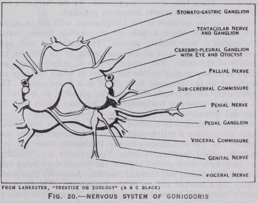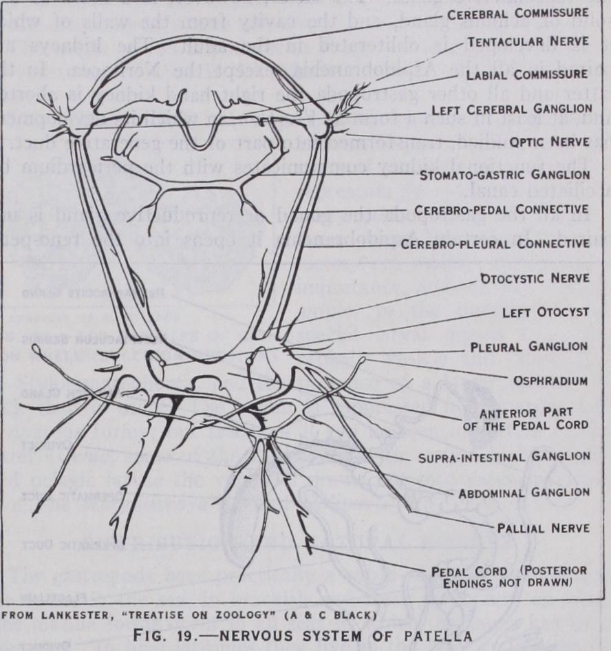 The Nervous System.—Ex cept in certain parasitic forms the nervous system is well devel oped. It consists of nerve cords, ganglia connected by commis sures and sense organs. The vari ous ganglionic centres and com missures are those found in other molluscs, viz., cerebral, pleural, pedal, visceral and stomatogas tric. Archaic traits are seen in certain Rhipidoglossa, e.g., the slight differentiation of some of the ganglia in Pleurotomaria.