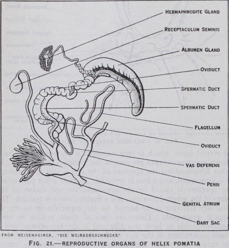 In certain primitive Streptoneura the eggs are fertilized ex ternally in the sea water; but in most members of the class the male has a penis and fertilization is internal. The courtship of certain land snails has been carefully stud ied, and as an example the complex be haviour of the Roman snail (Helix poma tie) which has been described by Meisen heimer should be studied. In many land snails courtship is usually accompanied by some act of violent stimulation, usually by means of a calcareous pointed rod (the dart) secreted in part of the male repro ductive system.