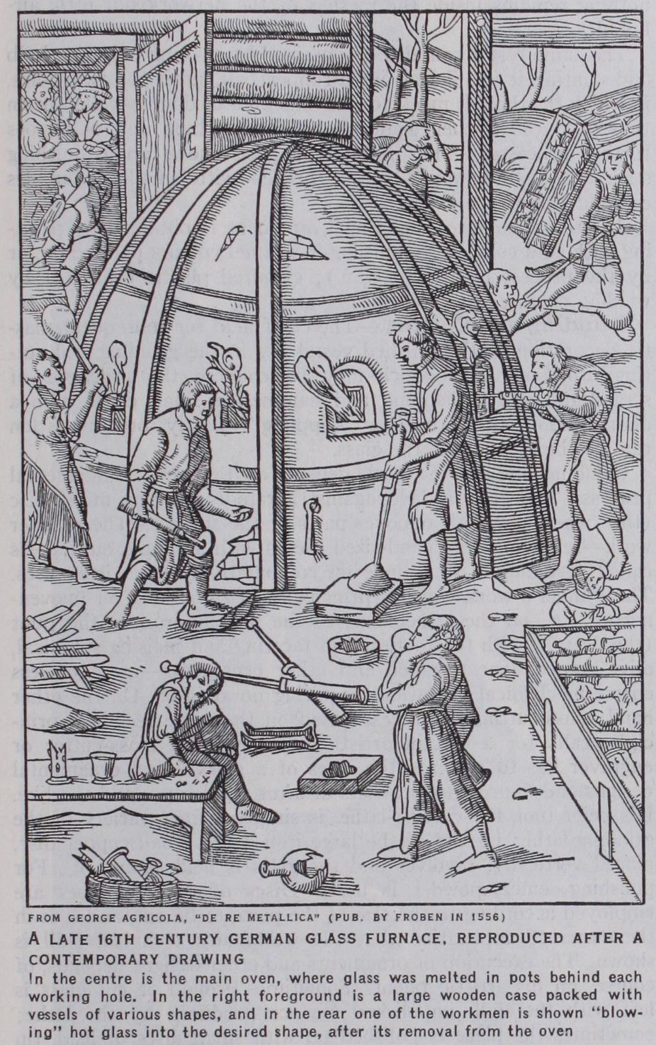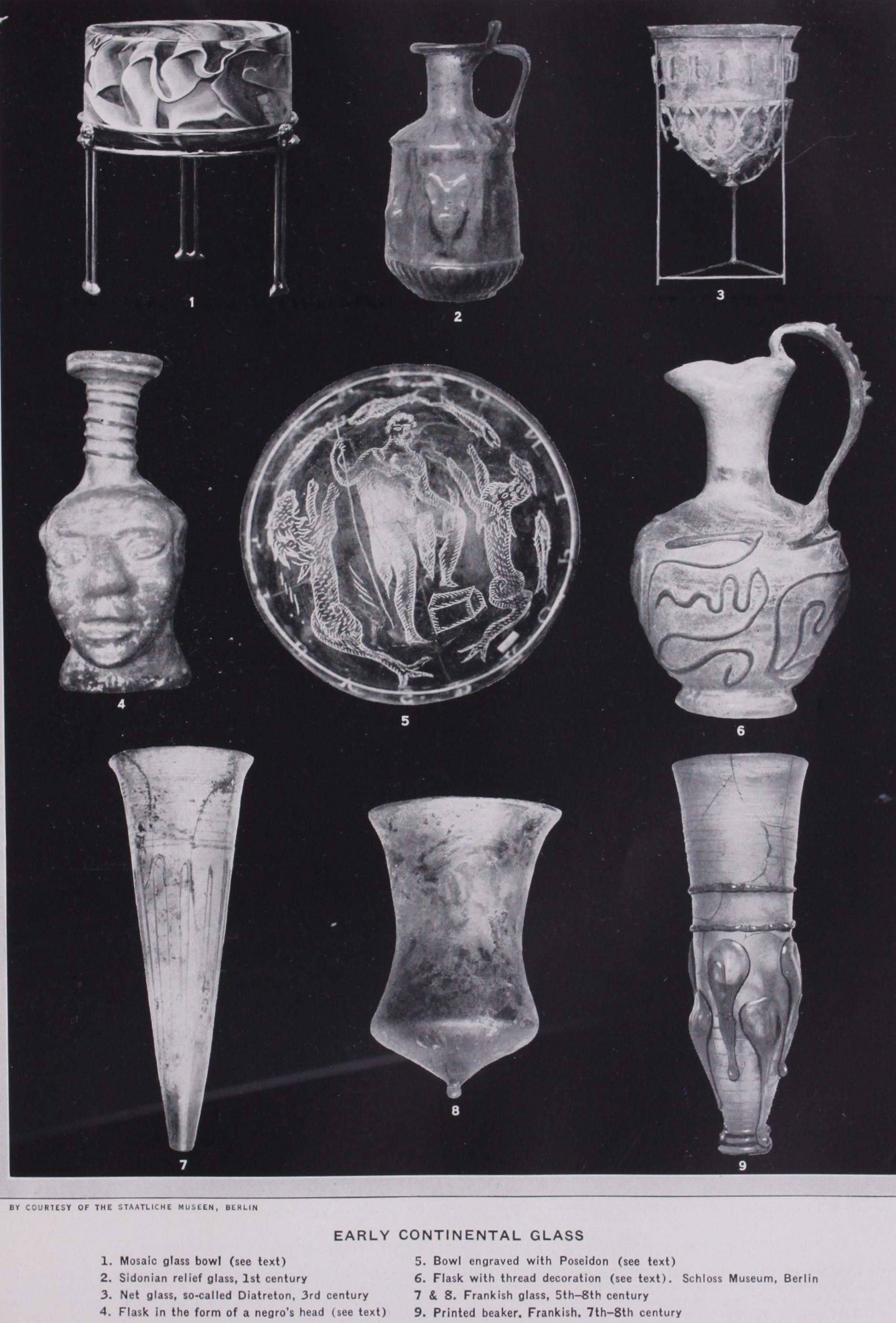 The glass can be moulded into any shape if the bulbs are blown into hollow moulds of stone, wood or metal, or, in the case of thick bowls, for example, if the glass-metal is pressed from within against the walls of such moulds.