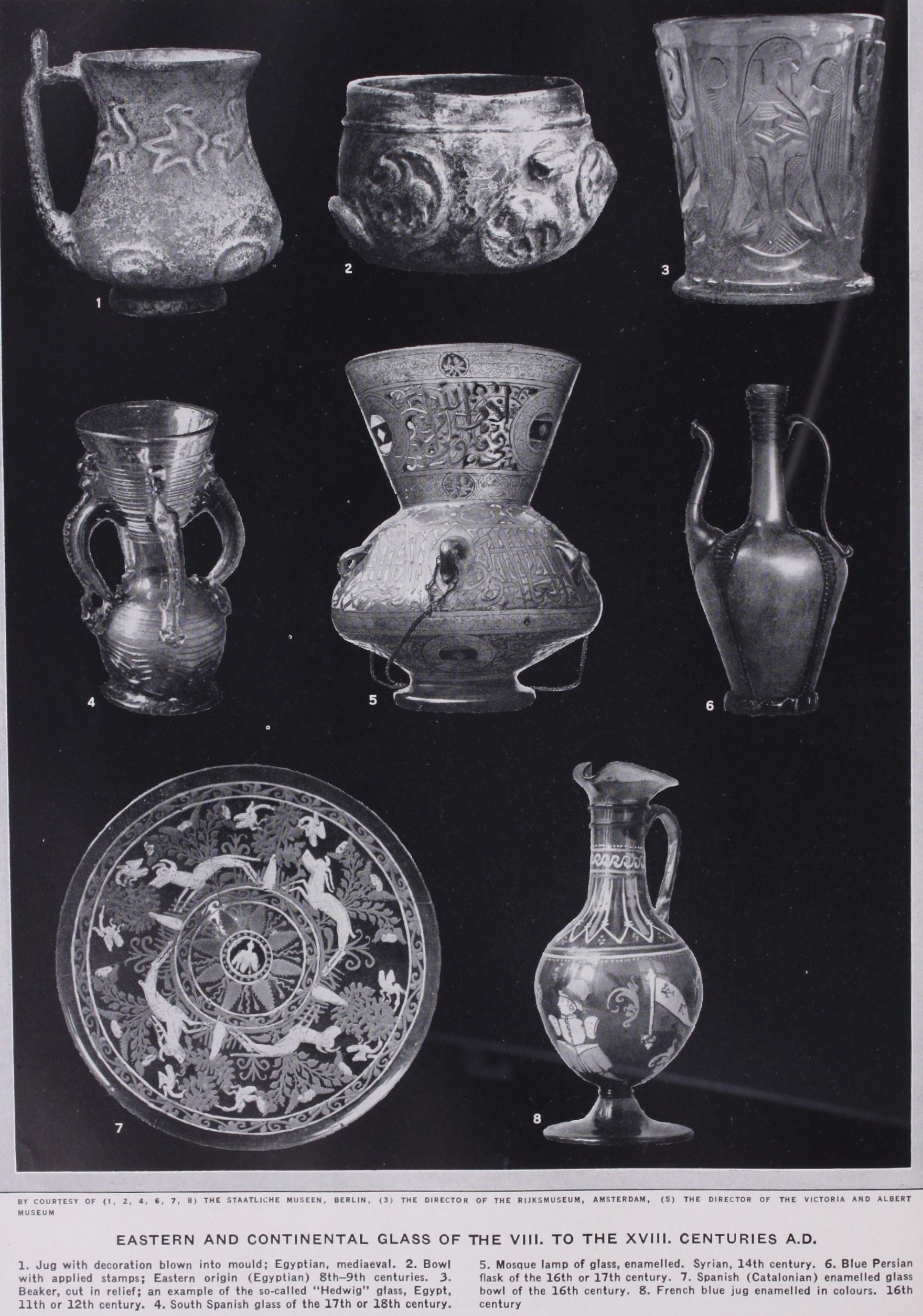Grinding and cutting both depend on the same fundamental process. The glass is held against a rapidly-rotating metal disc (the "wheel"), which removes parts of the surface. The rougher work—removing only good-sized pieces with a simple outline—is called "grinding." It is done on comparatively large iron discs. The grinder's work consists principally in smoothing off uneven nesses, e.g., on the attachment to the blowing-iron or the punt (the "cap"), with the foot, and in faceting and incising spherical, olive-shaped, lancet-shaped and other ornaments—more or less coarse mechanical operations requiring no artistry. On the other hand, glass-cutting, a process based on the same technical prin ciple, calls for a certain artistic capacity. The glass-cutter or engraver has to cut into the sides of a glass vessel ornamental designs and figures, script, coats-of-arms, landscapes and the like. His chief tool, the cutting-lathe, is simply a finer variety of the grinding-lathe ; instead of the large iron disc a small copper disc, placed vertically, revolves and the glass is held against it. For polishing, emery-powder is used. Discs of different sizes are employed according to the size of the piece to be cut, and it is in their correct application that the workman's technical skill is shown. The execution of ornaments and other designs depends, of course, on his artistic talent. Sometimes ground or cut glass is left with the dull, unpolished surface produced by the lathe; sometimes the piece is polished up with small discs of lead, tin or wood ("burnishing"). The commoner and simpler method of glass-cutting is "intaglio cutting," the ornament being cut into the surface; in "relief cutting," which is more difficult, the orna ment is left standing out and the surface of the glass is cut away round it (e.g., the Portland vase [Pl. V., No. 51, the Hedwig glasses [Pl. III., No. 3], and Gundelach's work [Pl. VI., No. 6]).