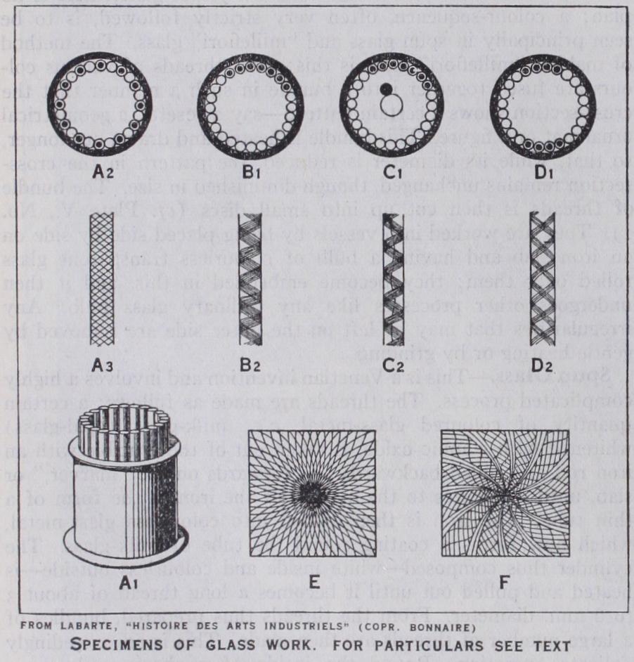 In making a vaso a ritorti a cylindrical mould is again employed. The rods are again arranged in any desired order, with or without uncoloured rods between them, on the inside of the cylinder. They are then gently heated, and into the hollow cylinder which they form a bulb of colourless glass is blown from above ; they adhere to this bulb, and on further heating and expansion they fuse completely with its surface. They are then pinched together just above the end of the bulb, so that they all meet at one point, while the intervals between them on the surface of the spherical bulb increase as it expands. As the bulb is blown out still more, its walls become thinner, and the rods are naturally pressed flat, so that the patterns inside them are squeezed out wide. The bulb is now subjected to the usual further processes. If it is not rotated, the rods run together like meridians on a globe ; but if it is rotated while the other processes are going on, they form rhythmical spirals which cover the entire vase with their sym metrical whirling curves (figs. E and F).