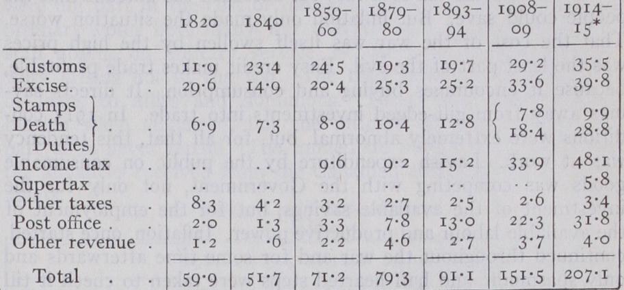 The following table shows the growth of taxation in the century preceding the Great War (in £ millions) : *Estimates from last peace-time budget.