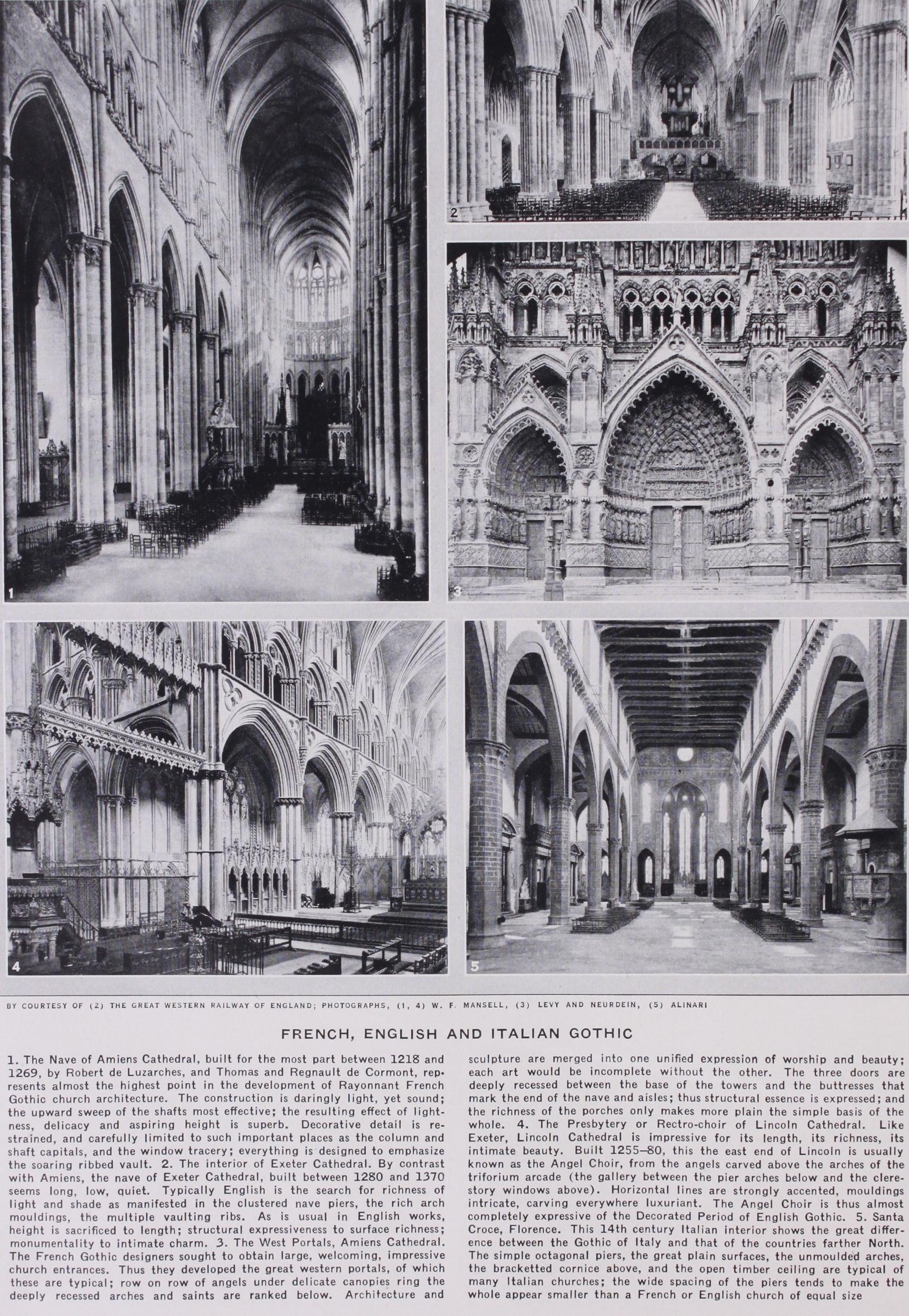 GOTHIC ARCHITECTURE IN ENGLAND Although pointed arches occur spasmodically in England in various buildings dating from the last half of the 12th century, English Gothic first appears in a complete form in the choir of Canterbury cathedral, built by the French architect William of Sens (1175-78). This was designed according to a predominantly French scheme, with a six-part vault, a developed chevet and crocketed capitals. Nevertheless, certain English characteristics appear in the generally low proportions and the amount of wall surface. Similarly, in Westminster Abbey (begun 1245), although the high vault and some of the tracery details are French in type, the ornament and arch shapes are purely English. Two main in fluences caused the difference between English and French work. The first was that in England no break or rivalry between the regular and secular clergy occurred such as that which had taken place in France. The monasteries were everywhere powerful. Especially important architecturally was the influence of the Cistercian order, with its insistence upon simplicity and restraint, to which was due, in no small part, the English abandonment of the chevet plan in favour of the square east end, as well as the development of the moulded capital without foliage, and the English skill in the invention of varied moulding profiles. The tradition of Norman church building strengthened the English Gothic love of simple wall and textured surface in place of the rigid French articulation. Thus the English never sought the soaring heights of the French churches, or the lavish use of carved ornament and sculpture.