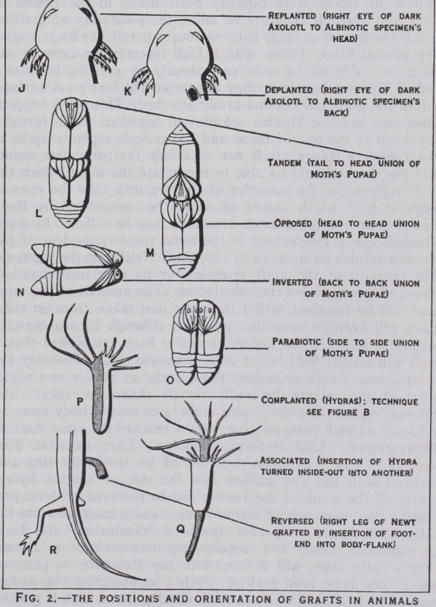 Antagonism of Graft and Re-growth.—Although a certain amount of regenerative capacity must reside in the tissues of stock and graft, if they are to unite, the possibility of grafting in a given species or stage is by no means parallel to its regenera tive potentialities. Forms with a high regenerative capacity are often very difficult to unite permanently by grafting because a bud of regenerating tissue may appear on the host's cut surface, before the graft has become firmly attached. This often happens when two headless Hydrae are grafted together. Each forms a new head at the line of union and the animals separate again as two complete beings. It is not necessary for permanent union, that the stock should be able to regenerate the organ which the graft represents. As examples of this we may take the eyes of frogs or rats, which cannot of course be regenerated by these animals. On the other hand structures may be difficult to graft, although easily regenerated in the same species : the legs of the crayfish furnish an instance of this kind. Neither is the regenera tive capacity of the graft essential for its permanent fixation. Pieces of young stages transplanted on older animals of the same kind will be resorbed, whilst the same part taken from an older stage will keep permanently attached, although its regenerative faculty is less. It has, indeed, recently been established that a graft will usually hold better on a weakened stock. Probably the latter cannot resorb or destroy the intruder as quickly as a vigor ous host, thus giving the graft a better chance to "take." The different regions of a developing embryo or animal body exert an influence on such parts as have not yet reached the same stage of differentiation. (See DEDIFFERENTIATION, EXPERIMENTAL EM