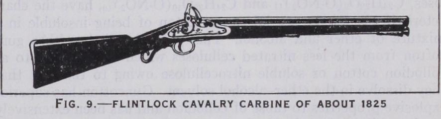 Firearms are said to have been first used in European warfare in the 14th century. The hand gun, it is found, came into practical use in 1446 and was of very rude construction. It consisted of a simple iron or brass tube with a touch-hole at the top fixed in a straight stock of wood, the end of which passed under the right armpit when the "gonne" was about to be fired. A somewhat simi lar weapon was also used by the horse-soldier, with a ring at the end of the stock, by which it was suspended by a cord round the neck; a forked rest, fitted by a ring to the saddlebow, served to steady the gun. This rest, when not in use, hung down in front of the right leg. A match was made of cotton or hemp spun slack, and boiled in a strong solution of saltpetre or in the lees of wine. The touch-hole was first placed on the top of the barrel, but afterwards at the side, with a small pan underneath to hold the priming, and guarded by a cover moving on a pivot.