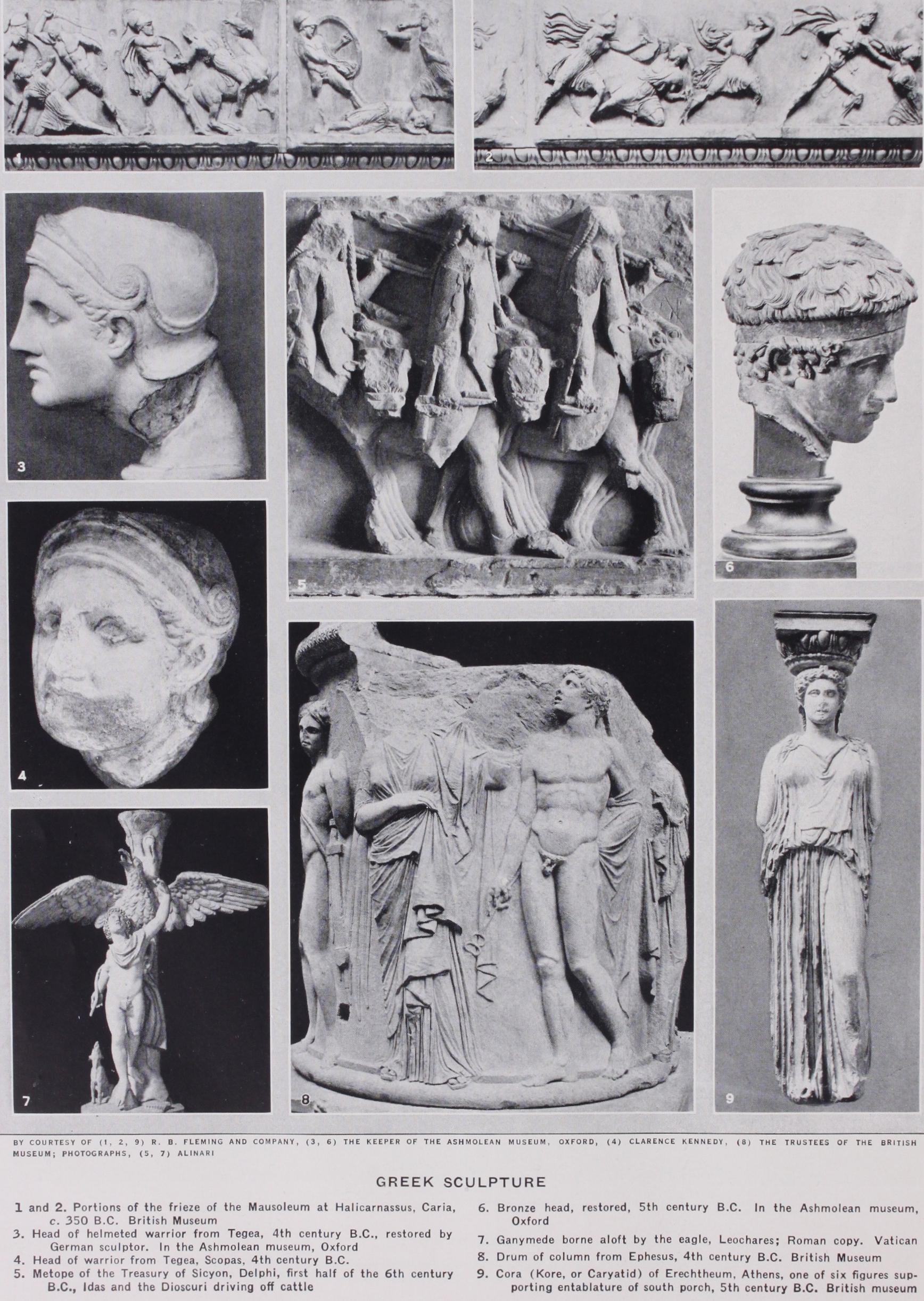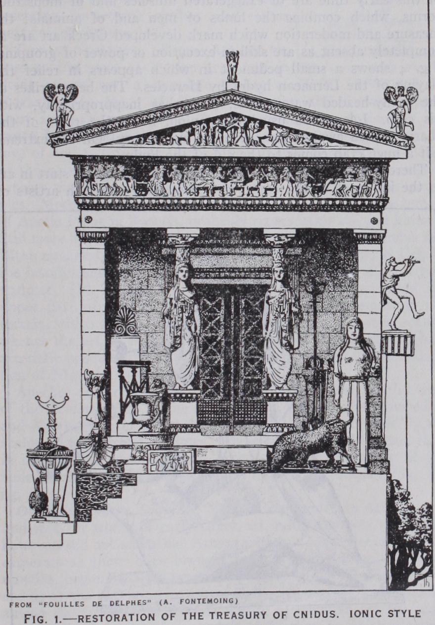 Here, however, our concern is not with the purposes or arrange ments of a temple, but with its sculptural decoration, and we would note that elaborate decoration is reserved for those parts of the temple which have, or at least appear to have, no strain laid upon them. It is true that in the archaic age experiments were made in carving reliefs on the lower drums of columns (as at Ephesus) and on the line of the architrave (as at Assus). But such examples were not followed. Nearly always the spaces re served for mythological reliefs or groups are the tops of walls, the spaces between the triglyphs, and particularly the pediments surmounting the two fronts, which might be left hollow without danger to the stability of the edifice. Detached figures in the round are in fact found only in the pediments, or standing upon the tops of the pediments. And metopes are sculptured in higher relief than friezes.