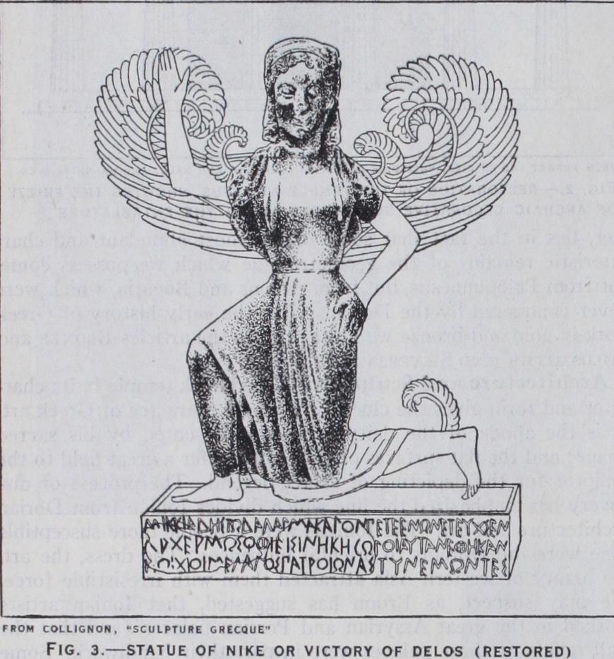 Of the decorative sculpture which adorned these early temples we have more extensive remains than we have of actual construc tion. It will be best to speak of them under their districts. On the coast of Asia Minor, the most extensive series of archaic decora tive sculptures which has come down to us is that which adorned the temple of Assus (fig. 2). These were placed in a unique posi tion on the temple, a long frieze running along the entablature, with representations of wild animals, of centaurs, of Heracles seizing Achelous, and of men feasting, scene succeeding scene without much order or method. The only figures from Miletus which can be considered as belonging to the original temple de stroyed by Darius, are the dedicated seated statues, some of which, brought away by Sir Charles Newton in the middle of the r gth century, are now preserved at the British Museum. At Ephesus J. T. Wood was more successful (1869-74) and recovered con siderable fragments of the temple of Artemis, to which, as Herod otus tells us, Croesus presented many columns. The lower part of one of these columns, bearing figures in relief of early Ionian style, has been put together at the British Museum; and remains of inscriptions recording the presentation by Croesus are still to be traced. Reliefs from a cornice of somewhat later date are also to be found at the British Museum. Among the Aegean islands, Delos has furnished us with the most important remains of early art. French excavators have there found a very early statue of a woman dedicated by one Nicandra to Artemis, a figure which may be instructively compared with another from Samos, dedicated to Hera by Cheramues. The Delian statue is in shape like a flat beam ; the Samian, which is headless, is like a round tree. The arms of the Delian figure are rigid to the sides; the Samian lady has one arm clasped to her breast. A great improvement on these inex pressive figures is marked by another figure found at Delos, and connected, though perhaps incorrectly, with a bases recording the execution of a statue by Archermus and Micciades, two sculptors who stood, in the middle of the 6th century, at the head of a sculptural school at Chios. The representation (fig. 3) is of a running or flying figure, having six wings, like the seraphim in the vision of Isaiah, and clad in long drapery. It may be a statue of Nike or Victory, who is said to have been represented in winged form by Archermus. The figure, with its neatness and precision of work, its expressive face and strong outlines, certainly marks great progress in the art of sculpture. When the early sculpture of Athens is examined, reason is found to think that the Chian school had great influence in that city in the days of Peisistratus.