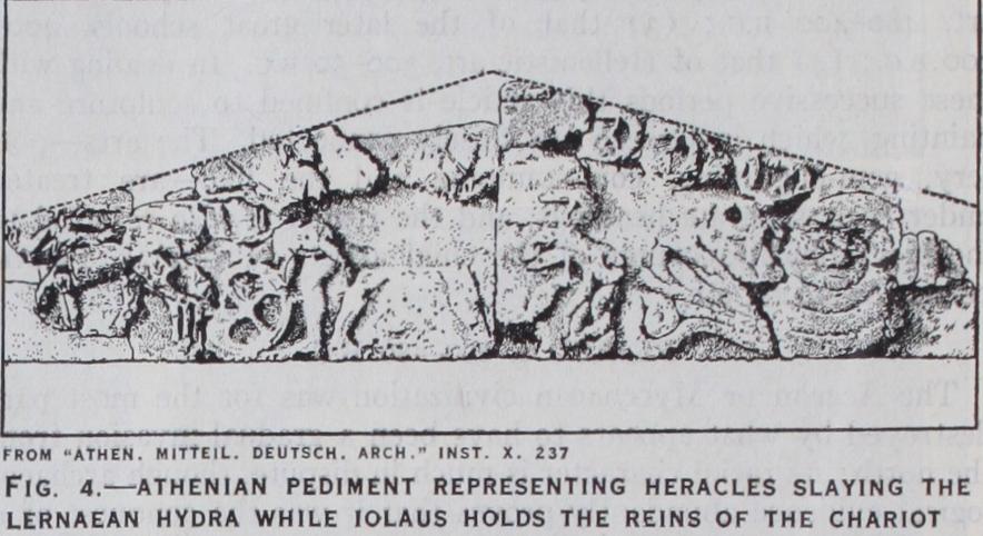 Athenian Sculpture. At Athens, in the age 650-48o, may be traced two quite distinct periods of architecture and sculpture. In the earlier of the two periods, a rough limestone was used alike for the walls and the sculptural decoration of temples ; in the later period it was superseded by marble, whether native or imported. Every visitor to the museum of the Athenian Acropolis stands astonished at the groups which decorated the pediments of Athenian temples before the age of Peisistratus—groups of large size, rudely cut in soft stone, of primitive workmanship, and painted with bright red, blue and green, in a fashion which makes no attempt to follow nature, but only to produce a vivid result. The two largest in scale of these groups seem to have belonged to the pediments of the early 6th century temple of Athena. On other smaller pediments, perhaps belonging to shrines of Heracles and Dionysus, there are conflicts of Heracles with Triton or with other monstrous foes. It is notable how fond the Athenian artists of this early time are of exaggerated muscles and of monstrous forms, which combine the limbs of men and of animals ; the measure and moderation which mark developed Greek art are as completely absent as are skill in execution or power of grouping. Fig. 4 shows a small pediment in which appears in relief the slaying of the Lernaean hydra by Heracles. The hero strikes at the many-headed water-snake, somewhat inappropriately, with his club. Iolaus, his usual companion, holds the reins of the chariot which awaits Heracles after his victory. On the extreme left a huge crab comes to the aid of the hydra.