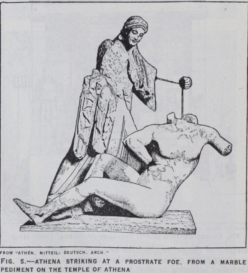 In the time of Peisistratus or his sons a peristyle of columns was added to the old temple of Athena; and this necessitated the preparation of fresh pediments. These were of marble. In one of them was represented the battle between gods and giants ; in the midst Athena her self striking at a prostrate foe (fig. 5) . In these figures no eye can fail to trace remark able progress. On about the same level of art are the charming statues dedicated to Athena, which were set up in the latter half of the 6th century on the Acropolis, whose graceful though conventional forms and delicate colouring make them one of the great attractions of the Acropolis mu seum. We show a figure (fig. 6) which is the work of the sculptor Antenor, who was also author of a celebrated group repre senting the tyrant-slayers, Harmodius and Aristogiton. To the same age belong many other votive reliefs of the Acropolis, rep resenting horsemen, scribes and other votaries of Athena.