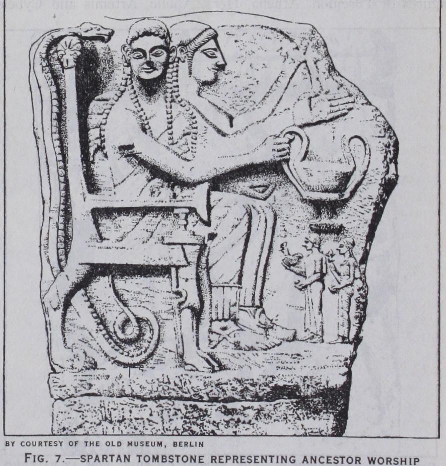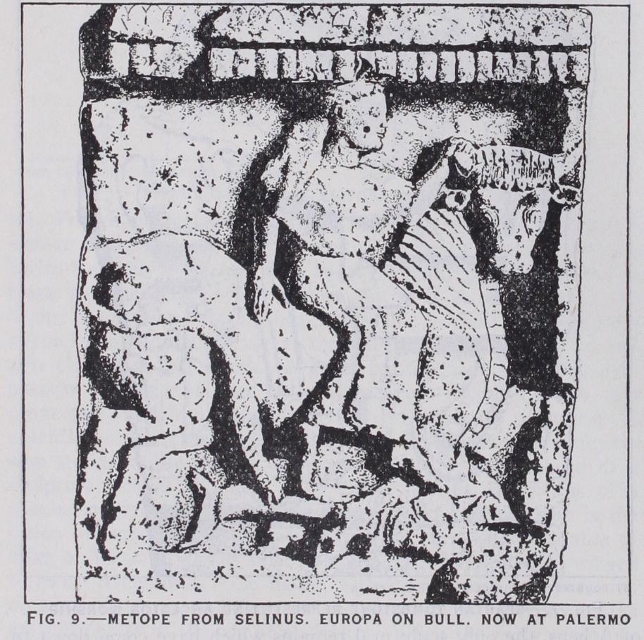 Excavations at Sparta have revealed interesting monuments belonging to the worship of ancestors, which seems in the con servative Dorian states of Greece to have been more strongly developed than elsewhere. On some of these stones, which doubt less belonged to the family cults of Sparta, are shown the ancestor seated holding a wine-cup, accompanied by his faithful horse or dog; on some we see the ancestor and ancestress seated side by side (fig. 7), ready to receive the gifts of their descendants, who appear in the corner of the relief on a much smaller scale. The male figure holds a wine-cup, in allusion to the libations of wine made at the tomb. The female figure holds her veil and the pomegranate, the recognized food of the dead. A huge serpent stands erect behind the pair. The style of these sculptures is as striking as the subject:—lean, rigid forms with severe outline, carved in a very low relief, the surface of which is not rounded but flat. The name of Selinus in Sicily, an early Megarian colony, has long been associated with some of the most curious of early sculptures, the metopes of ancient temples, representing the ex ploits of Heracles and of Perseus. Even more archaic metopes have in recent years been brought to light, one representing a seated sphinx, one the journey of Europa over the sea on the back of the amorous bull, a pair of dolphins swimming beside her. In simplicity and rudeness of work these reliefs remind us of the limestone pediments of Athens (fig. 4), but they are of another and a severer style; the Ionian laxity is wanting.