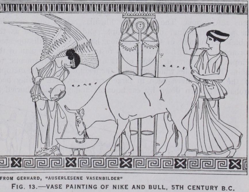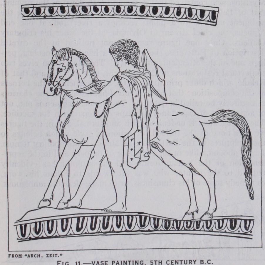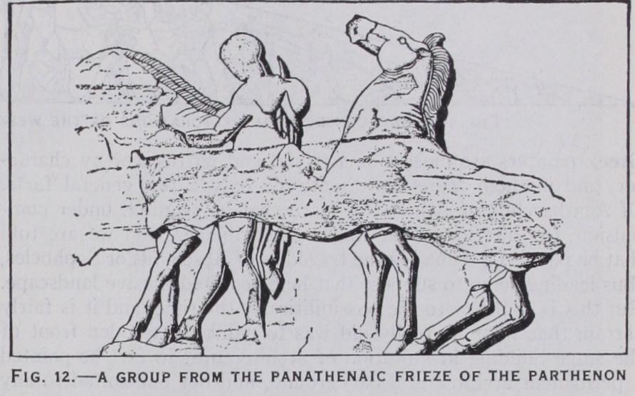 There can be little doubt that the school of Polygnotus exer cised great influence on contemporary sculpture. Panaenus, brother of Pheidias, worked with Polygnotus, and many of the groupings found in the sculptures of the Parthenon remind us of those usual with the Thasian master. At this simple and early stage of art there was no essential difference between fresco-paint ing and coloured relief, light and shade and aerial perspective being unknown. Two vase-paintings are shown, one (fig. I I), a group of man and horse which closely resembles figures in the Panathe naic frieze of the Parthenon (fig. 12) ; the other (fig. 13), repre senting Victory pouring water for a sacrificial ox to drink, which reminds us of the balustrade of the shrine of Wingless Victory at Athens.