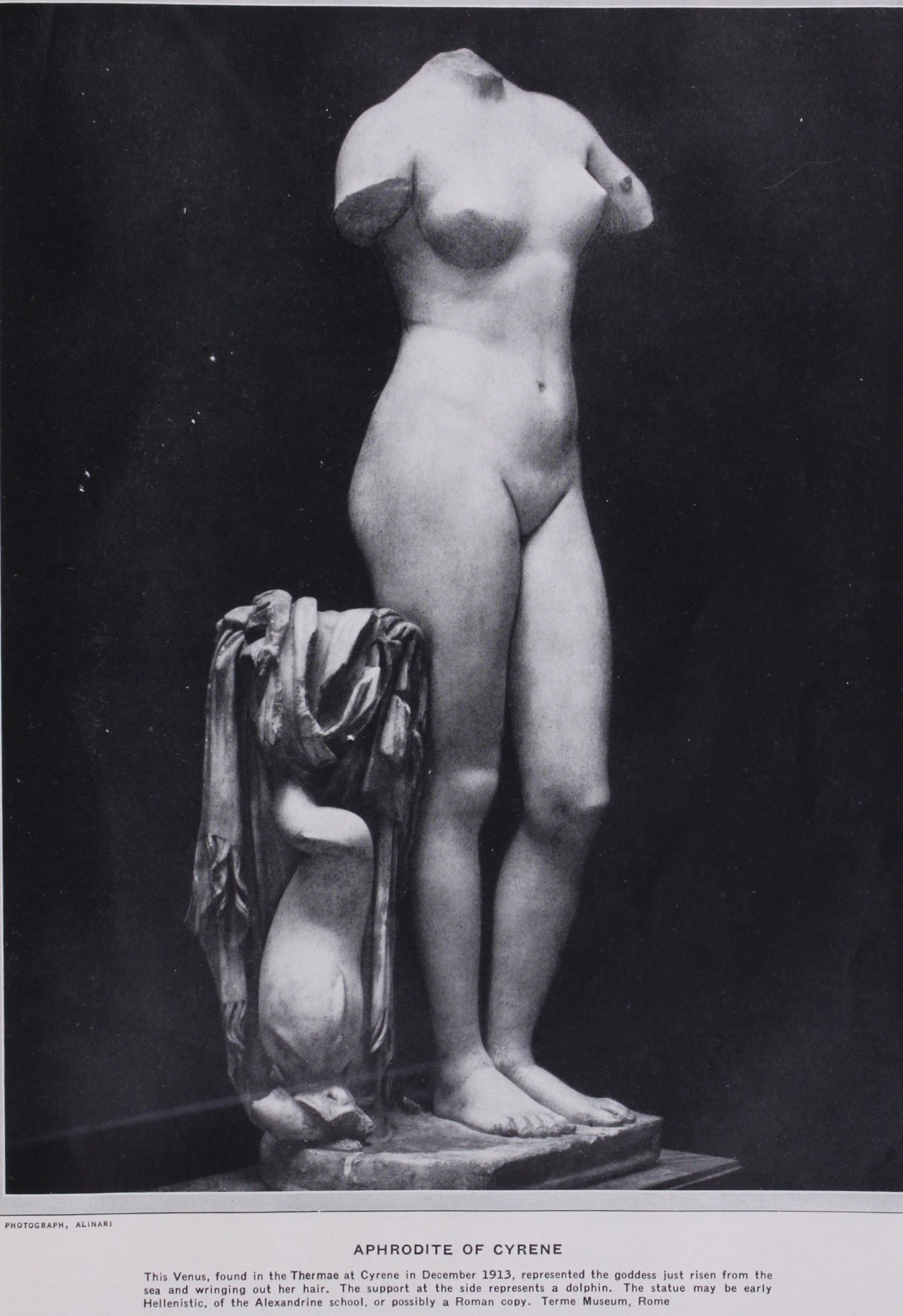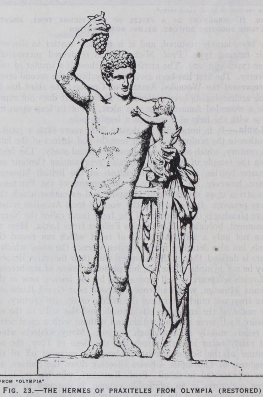The Hermes not only added to our knowledge of Praxiteles, but also confirmed the received views in regard to him. Already many works in galleries of sculpture had been identified as copies of statues of his school. Noteworthy among these are, the group at Munich representing Peace nursing the infant Wealth, from an original by Cephisodotus, father of Praxiteles; copies of the Cnidian Aphrodite of Praxiteles, especially one in the Vatican which is here illustrated (Pl. VI., fig. 6), and a torso in the Brit ish Museum (Pl. VI., fig. 5) ; copies of the Apollo slaying a lizard (Sauroctonus), of a Satyr (in the Capitol museum), and others. These works, which are noted for their softness and charm, make understandable the saying of ancient critics that Praxiteles and Scopas were noted for the pathos of their works, as Pheidias and Polyclitus for the ethical quality of those they produced. But the pathos of Praxiteles is of a soft and dreamy character; there is no action, or next to none; and the emotions which he rouses are sentimental rather than passionate. Scopas was of another mood. The discovery Qf the Hermes naturally set archaeologists searching in the museums of Europe for other works, which may from their likeness to it in various respects be set down as Praxitelean in character. In the case- of many of the great sculptors of Greece—Strongylion, Silanion, Calamis and others—it is of little use to search for copies of their works, since there is little trustworthy evidence on which to base our en quiries; but in the case of Praxiteles one really stands on a safe level.