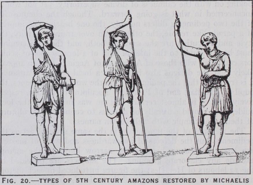 The form of the pediment is triangular; the height of the tri angle in proportion to its length being about i :8. The conditions of space are here strict and dominant; to comply with them re quires some ingenuity. To a modern sculptor the problem thus presented is almost insoluble; but it was allowable in ancient art to represent figures in a single composition as of various sizes, in correspondence not to actual physical measurement but to import ance. As the more important figures naturally occupy the midmost place in a pediment, their greater size comes in conveniently. And by placing some of the persons of the group in a standing, some in a seated, some in a reclining position, it can be so con trived that their heads are equidistant from the upper line of the pediment.