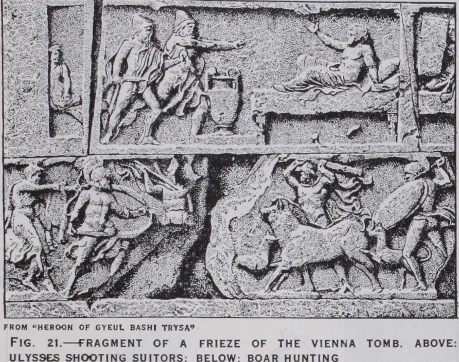 Lycian sculpture is well represented by the friezes, now in the Vienna Museum, which adorned a heroon near Gyeul Bashi and date from not much later than the middle of the 5th century. In the midst of the enclosure was a tomb, and the walls of the en closure itself were adorned within and without with a great series of reliefs, mostly of mythologic purport. Many subjects which but rarely occur in early Greek art, the siege of Troy, the ad venture of the Seven against Thebes, the carrying off of the daughters of Leucippus, Ulysses shooting down the Suitors, are here represented in detail. Prof. Benndorf, who has published these sculptures in an admirable volume, is disposed to see in them the influence of the Thasian painter Polygnotus. Anyone can see their kinship to painting, and their subjects recur in some of the great frescoes painted by Polygnotus, Micon and others for the Athenians. Like other Lycian sculptures, they contain non Hellenic elements ; in fact Lycia forms a link of the chain which extends from the wall-reliefs of Assyria to works like the columns of Trajan and of Antoninus,but is not embodied in the more purely idealistic works of the highest Greek art. A small part of the frieze of the Vienna tomb/is shown in fig. 2 r ; in this fragment are two scenes, one directly above the other ; in the upper Ulysses, accompanied by his son Telemachus, is in the act of shooting the suitors, who are reclining at table in the midst of a feast; a cup bearer, possibly Melanthius, is escaping by a door behind Ulysses; and in the lower is the central group of a frieze representing the hunting of the Calydonian boar, the boar being shown—as is usual in the best period of Greek art—as an ordinary animal and no monster.