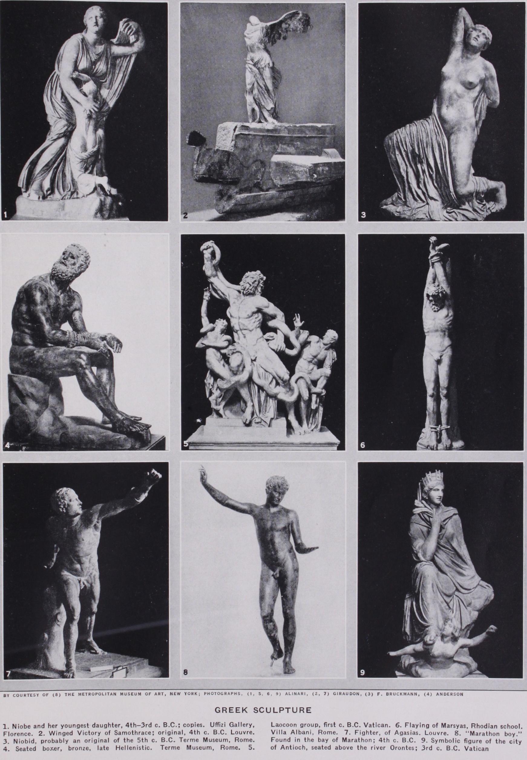 Since the Renaissance Rome has produced a continual crop of works of Greek art of all periods, partly originals brought from Greece by conquering generals, partly copies, such as the group at Rome formerly known as Paetus and Arria, and the overthrown giants and barbarians which came from the elaborate trophy set up by Attalus at Athens, of which copies exist in many museums. A noted work of kindred school is the group of Laocoon and his sons (Pl. VII., fig. 5), signed by Rhodian sculptors of the rst cen tury B.C., which has been perhaps more discussed than any work of the Greek chisel, and served as a peg for the aesthetic theories of Lessing and Goethe. In our days the histrionic and strained character of the group is regarded as greatly diminishing its inter est, in spite of the astounding skill and knowledge of the human body shown by the artists. To the same school belong the late representations of Marsyas being flayed by the victorious Apollo, a somewhat repulsive subject, chosen by the artists of this age as a means for displaying their accurate knowledge of anatomy.