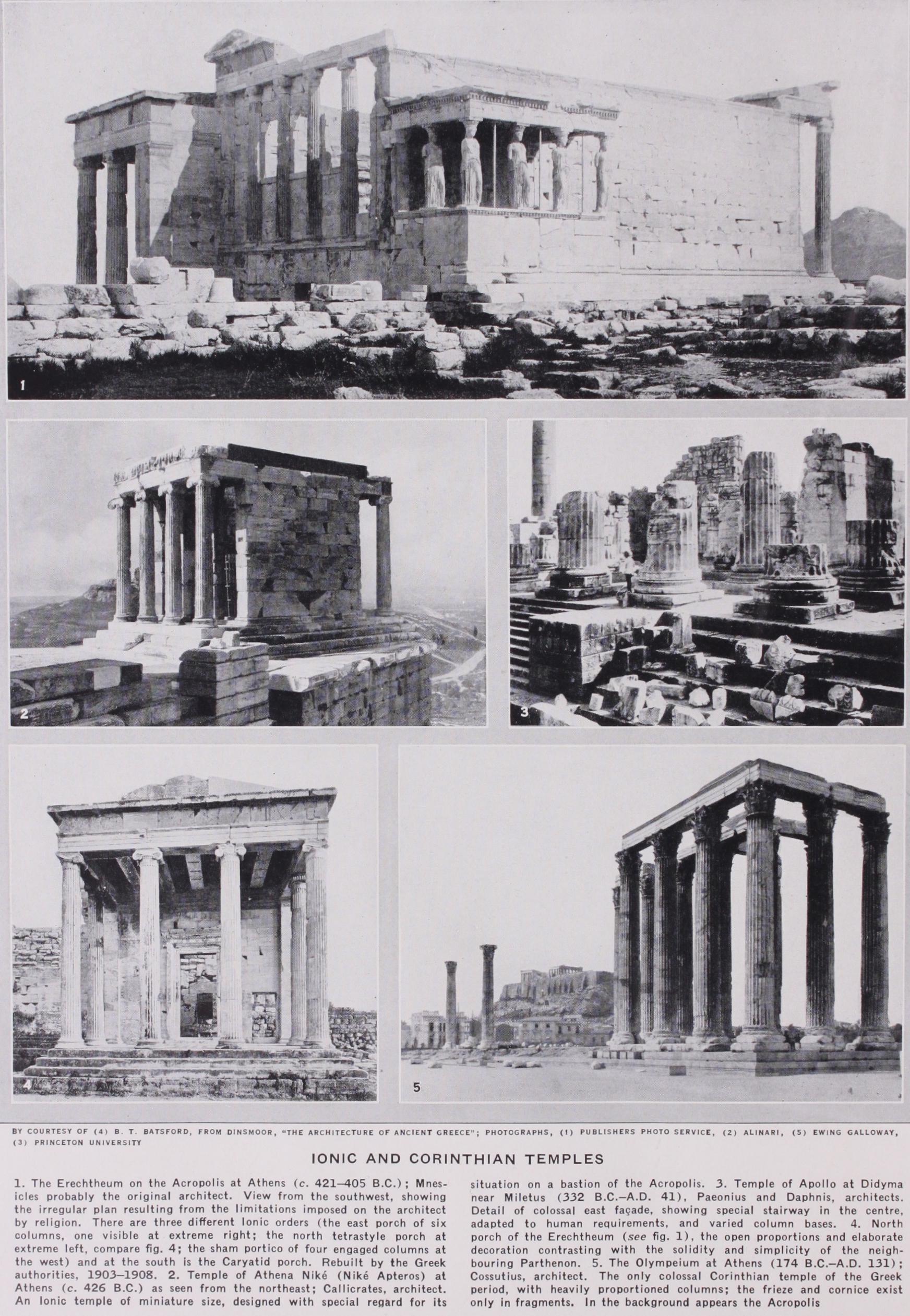 The Ionic style was also employed independently in three non peripteral temples at Athens (on the river Ilissus, the Nike temple and Erechtheum on the Acropolis)'; its foothold in Hellas was now assured. The amphiprostyle tetrastyle plan was preferred, though in the Erechtheum the rising ground at the east so elevated the stylobate that six columns were required in the width ; and the tetrastyle portico originally planned for the west end was revolved to the north flank to respect the sacred olive-tree, bal anced by the miniature Caryatid portico on the south, and replaced on the west by a sham portico of engaged columns, producing an irregular T-shaped plan. Columns tended toward slenderness but with great variety of proportion, from 7 7 to ro diameters, with intervals from 2 to 3 diameters, as columns were smaller or larger; the Doric rule was reversed to emphasize Ionic light ness. Bases, after an experimental flaring type at Bassae, assumed the Attic profile with one scotia between two tori. Capitals, apart from the experimental form at Bassae with angular volutes con nected by an arched cushion without an abacus, remained elongated brackets ; those of the Erechtheum were specially en riched by intermediate fillets in the volutes, inlaid gilded stems ending in palmettes, an extra torus moulding with coloured glass beads, and a flowered necking. The architrave, plain at first, soon resumed its fascias ; but the frieze had come to stay and in consequence the dentils were omitted, except in the Caryatid Portico which reproduces the Asiatic form ; and with these higher proportions the entablature was one-fourth or two-ninths of the column height. Rampant antefixes above the sima of the Erech theum, and its elaborately carved mouldings, exceptional in the 5th century, foreshadow the elaboration of the following period.