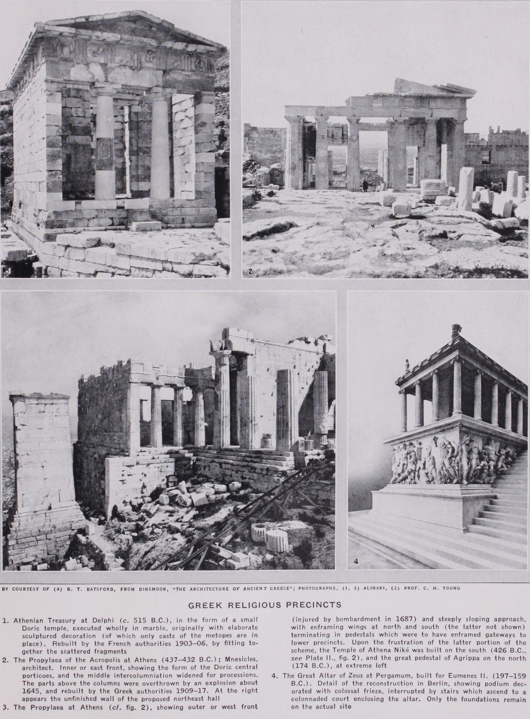 Among other types of build ings, additional treasuries at Olympia, the reconstructed ob long Telesterion at Eleusis and the similar Cnidian Lesche (club house) at Delphi, the Old Propy lon of the Athenian Acropolis, great porticoes such as the Royal and Painted Stoas at Athens, the reformed Athenian theatre with wooden scene buildings, and the imitation of the oriental gridiron city plan at Miletus, all paved the way for the masterpieces of the following period.