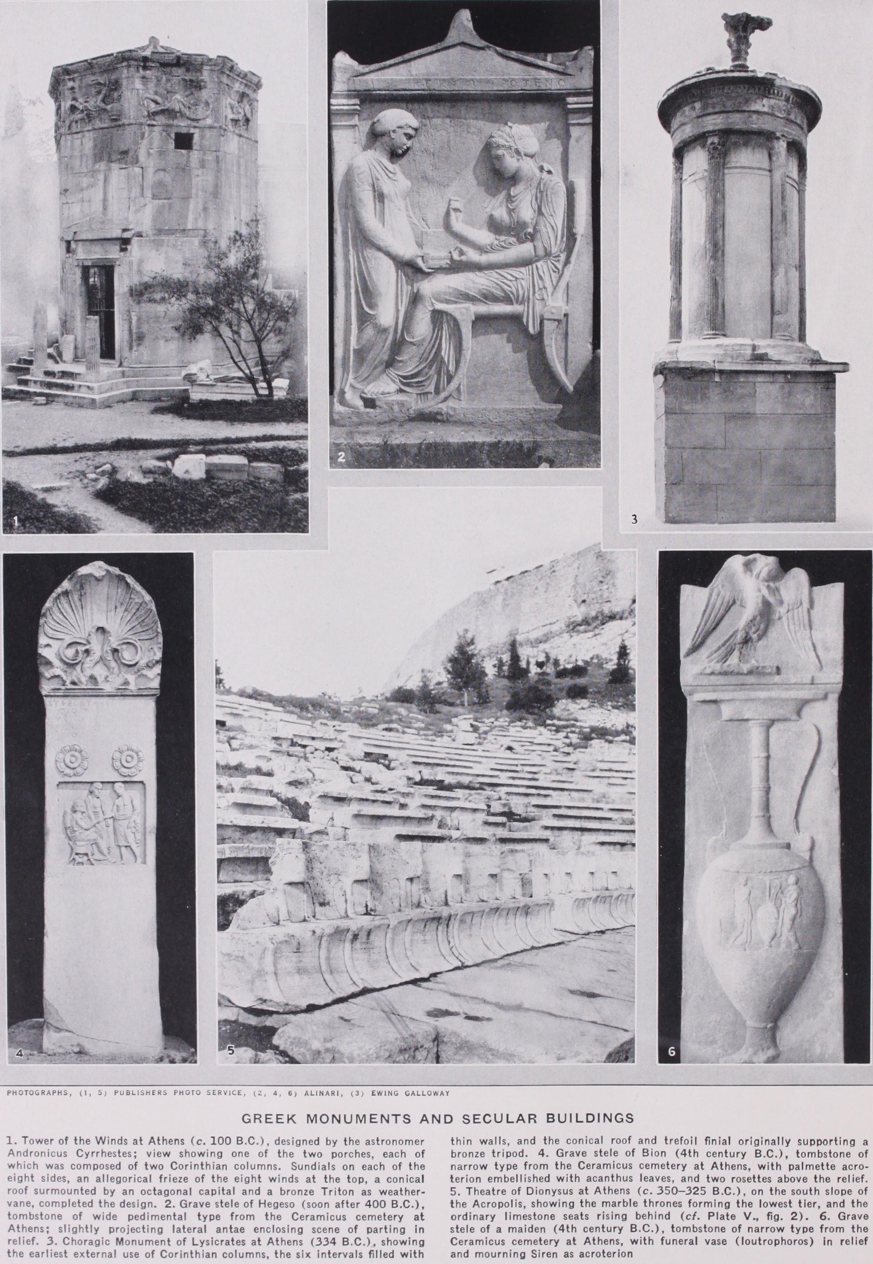 Important buildings other than temples were erected in both styles. In the Doric a peristyle at Thoricus, treasuries at Delphi, choragic monuments at Athens, tholoi at Delphi and Epidaurus, the huge dodecastyle facade of the Telesterion at Eleusis and the analogous assembly-hall (Ther silion) at Megalopolis, porticoes up to 55o ft. in length as at Cor inth, the Arsenal of 43o ft. at the Piraeus, the Lion tomb at Cnidus (another Doric intrusion in the East), all testify to the vitality of the style. The tholos was re produced in the Ionic style at Olympia ; monumental Ionic tombs in Asia Minor, the Nereid monument at Xanthus (a temple raised on a lofty pedestal) and the Mausoleum at Halicarnassus (with a pyramid in turn elevated above a peristyle of 36 columns, attaining a height of 136 ft.), have remained unsurpassed in their field.