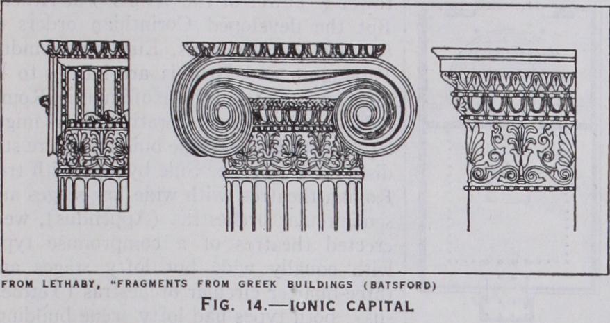 The heavy shafts were. relieved by tapering and by flutes, 16 to 5o in number, 20 being the final preference. The hollow necking and astragal inherited from Aegean prototypes 3radually appeared, until three or four incisions alone distinguished necking from shaft. The abacus spreading to 23 times the upper column diameter (forming slabs up to 13 ft. square), making the echinus curve almost horizontal, contracted and the echinus stiffened. Triglyphs at first appeared only above columns, leaving horizontal oblong metopes between; interpolated triglyphs next reduced the metopes to vertical oblongs, which gradually approached ness, the half mutules above the narrow metopes then becoming of full width. Relief sculpture succeeded painting in the metopes and pediments, changing in the latter to free statues; human and animal forms replaced the semicircular xcroteria, and the antefixes changed from semicircles to prismatic forms, surmounted by palmettes. Such vagaries as flutes ending in petals, the echinus carved with rosettes or lotus, the architrave carved as a frieze or crowned by heavy Ionic mouldings, the frieze omitted, triglyphs lated to columns, pentaglyphs substituted for triglyphs—these show that the style was yet in a formative and uncanonized stage. The Ionic column, carrying a lighter entablature and longer habituated to stone, was more slender from the very beginning (about 8 diameters), with greater intervals (11 to 23 diameters) ; particularly noteworthy were the enormous intervals of the facades. Bases became more complex, a torus horizontally fluted above and a disc fluted or with two deep scotias below. The shaft had narrow flutes with sharp arrises, 18 to 48 according to size, the flutes later deepening with separating fillets, 24 in number.