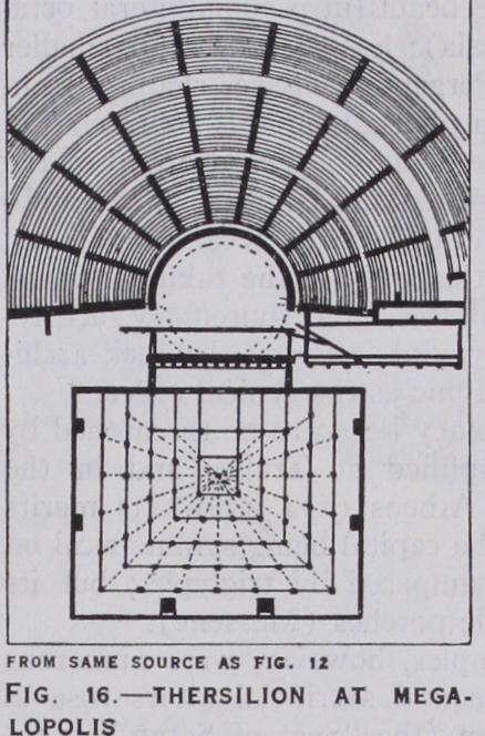 Even more important than temples, however, were numerous other types of buildings. Monumental sacrificial altars rose at Syracuse (74X653 ft.), Pergamum (the "Seat of Satan," II2X I2o ft.), Priene, and Magnesia. Doric porticoes surrounding the temples (Ephesus, Priene, Magnesia) ; vast stoas built by Hel lenistic kings for the cities of Asia (Pergamum, Assos, Priene) and Hellas (Delos, Delphi, Athens, Megalopolis, Olympia), or, with slight modifications, used as market-halls (Aegae, Alinda, Assos) and libraries (Pergamum) ; monumental propylaea (Samo thrace, Delos, Lindos, Epidaurus, Olympia and Selinus), the tholos at Samothrace, the hypostyle hall at Delos and gymnasia (Epi daurus, Priene) ; all repeated earlier forms with slight variation. The long "Hall of the Bulls" at Delos surmounted at one end by a tower, the soaring lighthouse of 40o ft. at Alexandria, and small senate-houses with semicircular or rectangular auditoria imitated from the theatre (Miletus, Priene), were innovations. The theatre itself received a colonnaded stone proscenium before the scene building, of which the great openings were elevated to an upper storey (Oropos, Epidaurus, Priene, Ephesus). Commemorative monuments were more lofty, high pedestals (Delphi, Athens) or pair of columns supporting entablatures (Delphi), forerunners of the Roman triumphal arch. Private houses changed from the megaron type to the peristyle court (Priene, Delos), and in their likeness were designed great hotels with central courts (Epidaurus, Olympia). The market-place became a formally enclosed rectangle (Magnesia) rather than a picturesque group of colon nades and public buildings. The roads outside the city gates were lined with an ever increasing variety of sepulchral monu ments, including the Mausoleum type (Acragas, Mylasa) and tumuli with vaulted chambers (Pergamum).