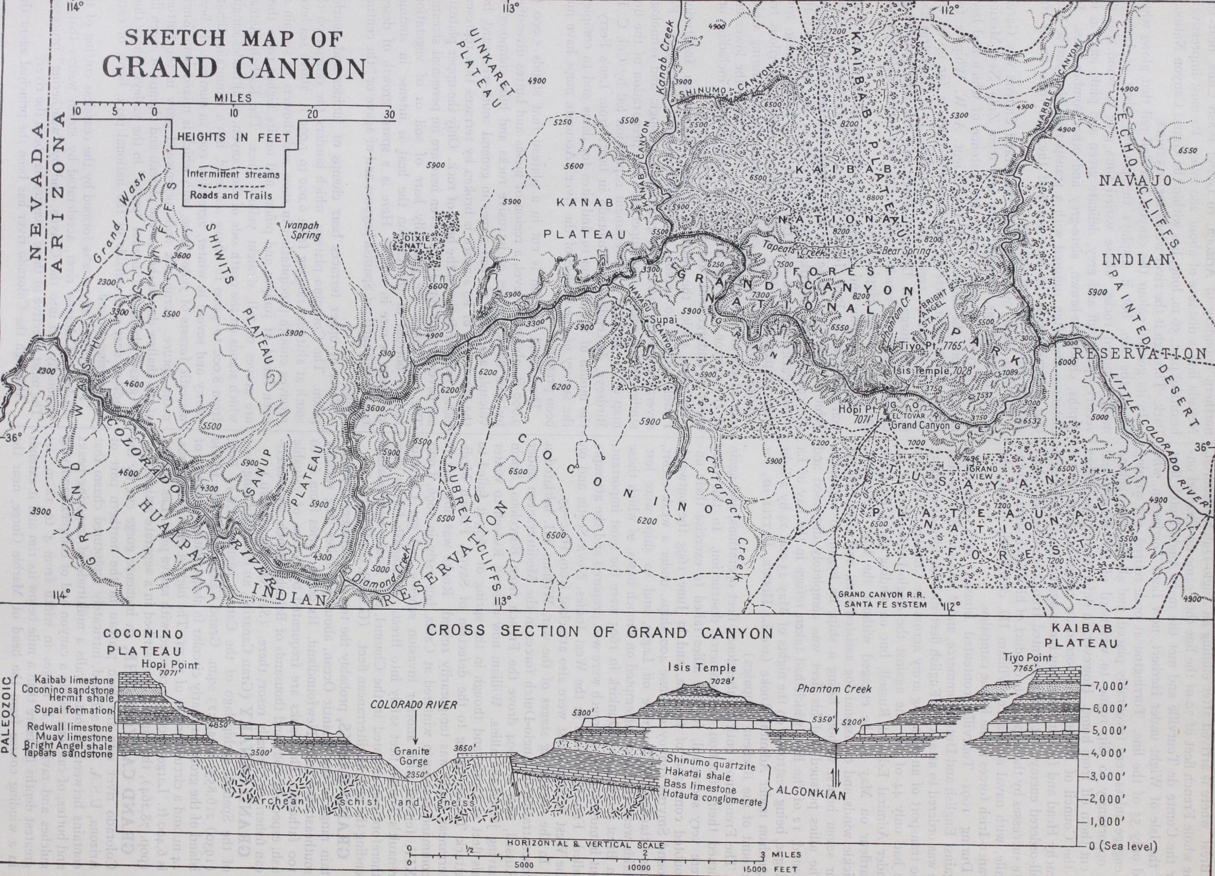While the river has been cutting its way downward the land in the plateau region has been gradually rising, and both the up lift of the land and the carving of the canyon are events of recent geologic history. The Grand Canyon is a relatively new geologic feature, even though the work of making it has been carried on for more than a million years. Although the canyon is new, the beds of rock exposed in it are old ; they tell a story that began many millions of years ago. Most of the geologic forma tions in the canyon are sedimentary—that is, were laid down in water—but the Coconino sandstone, which underlies the Kaibab limestone, the uppermost formation exposed in the walls of the canyon, appears to be in part, at least, a deposit of wind-blown sand, a sort of fossil desert. At some places volcanic rock is seen. The rock that lies below the sedimentary series is the Vishnu schist, which is greatly squeezed and crumpled and into which were injected, at some places, molten masses of igneous rock that formed dikes and sills. The red Supai formation, which underlies the Coconino sandstone and which forms the wall of the part of the canyon in which the Supai Indians live, imparts the colouring matter of its shaly beds to the underlying Redwall limestone, a hard rock which is in itself pale blue and which forms steep cliffs that can be easily traced through the canyon. At the foot of the Redwall begin the slopes of the light-buff Muav limestone and the greenish Bright Angel shale, which lead down for 70o ft. to the broadest and lowest terrace of all, the Tonto platform.