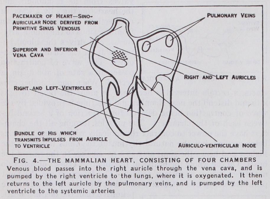 The heart of an elasmobranch such as the dog-fish is a good example of a primitive vertebrate heart. It con sists of four divisions, the sinus venosus, the auricle, the ventricle and the bulbus arteriosus. Each of these chambers is divided by valves from its neighbours and the heart functions by a wave of contraction which passes down from the sinus to the bulbus arte riosus, and drives the blood be fore it from one chamber to an other. This wave of contraction passes at a rate of about 4in. a second. When one chamber con tracts, a certain interval is necessary to allow the blood to pass into and distend the next chamber and this time is provided by the wave of contraction being delayed for a fraction of a second be tween each of the chambers. The muscles forming all the cham bers have the power to contract rhythmically without any stimulus being applied, but the natural rhythm of the sinus muscle is the highest and hence the sinus acts as a pacemaker to the rest of the heart. On the whole the hearts of the different classes of fishes do not differ in any important respect. The lampreys are the most primitive group of vertebrates and their hearts are slightly more primitive than the dog-fish heart, but the general arrangement and properties are the same. In the teleosts there is no true bulbus ar teriosus, but otherwise there is no important difference from the elasmobranch heart. The dipnoi of lung fishes, however, show an important variation. This order is only represented by a few scat tered species, but these show the first primitive attempt of a water living vertebrate to acquire the power of air breathing. They pos sess lungs, and the veins from the lungs open into a portion of the auricle, which is separated from the rest by an incomplete septum. The oxygenated blood coming from the lungs is thus separated in the heart from the reduced blood that comes from the rest of the body.