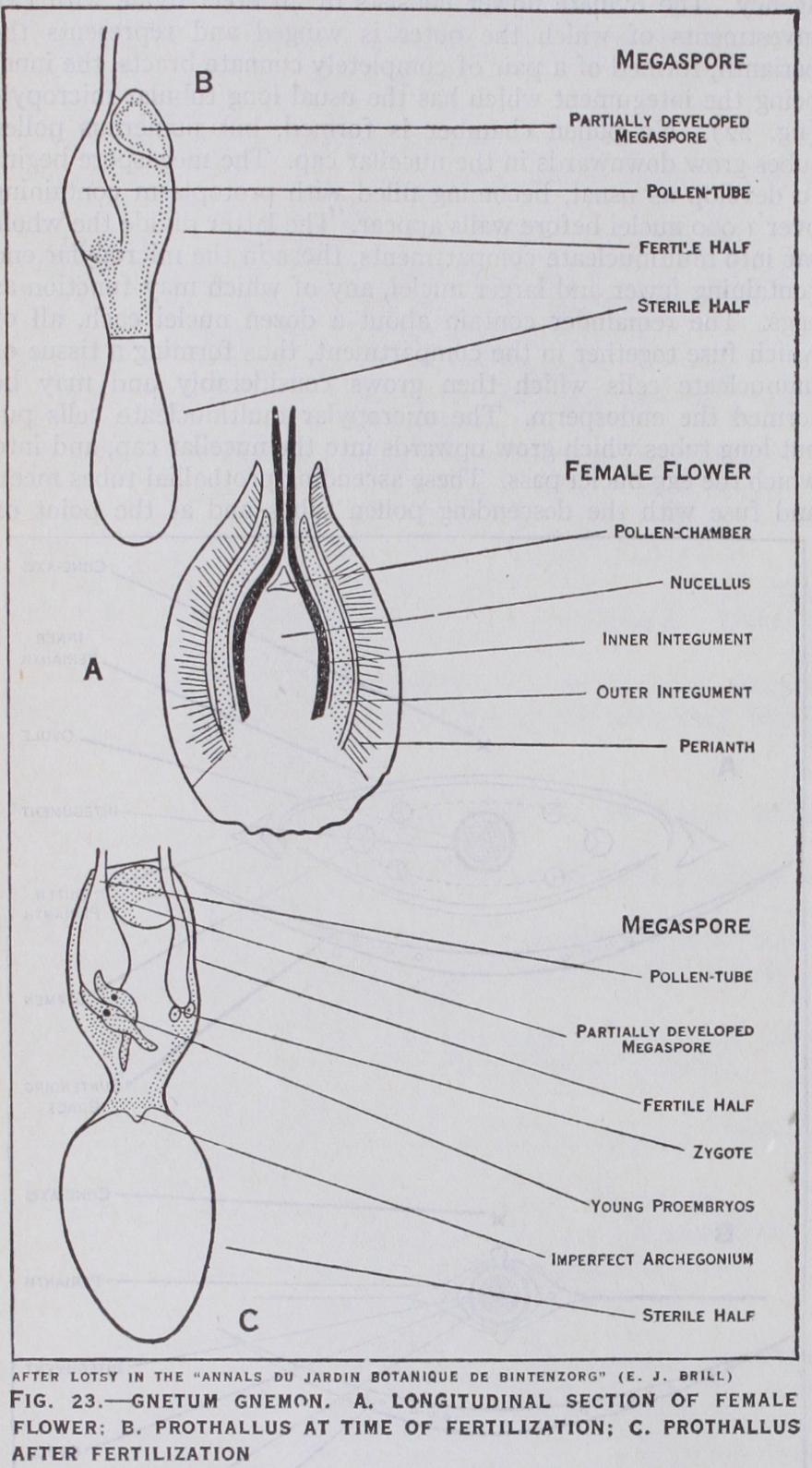Welwitschia.—W. mirabilis is the only species of this remark able genus and is found in two isolated and restricted areas of the coastal desert region of Damaraland in South-west Africa. It is by far the most remarkable member of the Gnetales not only in its habit but also both in the form of its flowers and the details of its development. Knowledge of these details is largely due to investigations carried out by H. H. W. Pearson. An adult plant has somewhat the form of a gigantic radish two to four feet in diameter, projecting less than a foot above the ground, and terminating in a long tap-root below. The two strap-shaped leaves trail along the ground to a length of i oft. or more, and become split into a number of narrow thong-like strips. They re tain the power of growth at the base throughout the life of the plant which probably exceeds i oo years. The characteristics of the plant accord well with the interesting suggestion that it may represent an "adult seedling." Numerous circular pits occur on the concentric ridges of the depressed and wrinkled crown, mark ing the positions of former inflorescences, new ridges subsequently appearing outside the old ones. The inflorescences have the form of dichasially branched stalks bearing the cones, from one to 20 in the female plant and up to 5o in the male. The female cone is about an inch long and scarlet in colour, the male smaller and more slender. Each consists of an axis bearing a large number of alternating pairs of overlapping bracts, in the axils of which are the flowers. The staminate flower (fig. 22) is enclosed by a perianth of two opposite pairs of bracts, surrounding a ring of six stamens united below but free above and each terminating in a trilocular anther. In the centre of the flower is an abortive ovule the integument of which projects upwards as a spirally twisted tube with a expansion at its apex. In the development of the pollen grain, a single prothallial nucleus is cut off, which disappears again about the time of pollination. There are only two further divisions resulting in a tube nucleus and two male nuclei, the formation of a stalk cell which occurs without exception in all conifers, as well as in Ephedra, being omitted. There is evidence that pollination is effected by insect agency. The ovulate flower consists of an erect ovule with two investments of which the outer is winged and represents the perianth, formed of a pair of completely connate bracts, the inner being the integument which has the usual long tubular micropyle (fig. 22). No pollen chamber is formed, but numerous pollen tubes grow downwards in the nucellar cap. The megaspore begins to develop as usual, becoming filled with protoplasm containing over i,000 nuclei before walls appear. The latter divide the whole sac into multinucleate compartments, those in the micropylar end containing fewer and larger nuclei, any of which may function as eggs. The remainder contain about a dozen nuclei each, all of which fuse together in the compartment, thus forming a tissue of uninucleate cells which then grows considerably and may be termed the endosperm. The micropylar multinucleate cells put out long tubes which grow upwards into the nucellar cap, and into which the egg nuclei pass. These ascending prothallial tubes meet, and fuse with the descending pollen tubes and at the point of fusion, fertilization occurs. The fertilized egg forms a wall and elongates into a tube from which an embryo tip cell is cut off, the remainder of the tube being the suspensor which carries the em bryo deep into the endosperm. The further development is similar to that in Ephedra, including the formation of embryonal tubes from the young embryo.