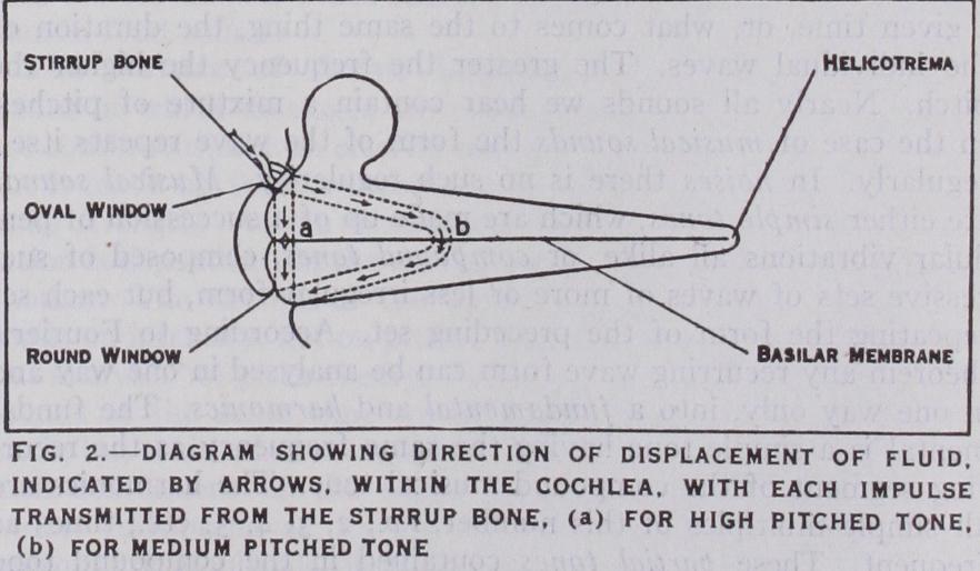 Physiological Evidence in Favour of the Resonance Theory.—Yoshi showed that long continued subjection of guinea pigs to tones of one pitch produced damage to the cochlea at levels varying with the pitch. High pitched tones damaged the basal coil whilst lower pitches affected levels nearer the apex. Ritchie Rodger and Putelli found that in boiler makers' deafness loss of hearing was principally for those tones to which they were con stantly subjected whilst at work. Weinberg and Allen found that fatigue induced by tones of one pitch caused relative deafness for that pitch, but not for other pitches. All these observations tend to show the existence of separate pitch receptors in the ear, and those of Yoshi afford evidence that these receptors form a graduated series at different levels of the cochlea. Though by no means universally accepted, the resonance theory is advancing in favour with physiologists, as it is recognised that it offers a reason able explanation of the main facts of hearing.