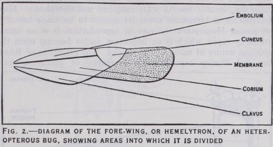 I. HETEROPTERA Wings generally overlapping on the body when at rest, the fore-pair usually hardened, the apex only being membranous. Pronotum large ; tarsi generally 3-jointed. The Heteroptera in clude both terrestrial and aquatic families the most important of which are the following:— Series I. GYMNOCERATA.-An - - - - -- tennae conspicuous ; terrestrial or in some cases living on the surface of water. The Pentatomidae or shield bugs are rather large and often brightly coloured insects, characterised by the great size of the scutellum which sometimes covers the abdomen (fig. 3) . The Coreidae have a smaller scutel lum and the antennae are placed high upon the head : the squash bug (Anasa tristis) of the U.S. is a well known example. The Lygaeidae are related to them, but the antennae are placed lower on the head : the American chinch bug (Blissus leucopterus) is well known and the family includes about 5o British species. The Pyrrhocoridae or red bugs differ from Lygaeidae in having no ocelli; most species have bright red, or green, and black colora tion and the injurious cotton-stainers (Dysdercus) are well known examples. The Tingidae or lacebugs are small creatures, whose integument exhibits a beautiful net-like pattern and the tarsi are 2-jointed. The Hydrometridae are a large family of pond-skaters which are clothed below with silvery pubescence : the genus Halobates and its allies (fig. 4) occur far out on the ocean in warm latitudes. The Reduviidae are a family of over 2,000 species, with a prominently curved rostrum: they mostly live on the blood of other insects, while species of Triatoma and Reduvius suck the blood of man. The Cimicidae (fig. 5) are the well known bed-bugs (Cimex) which are blood-suckers of mam mals and birds and the Polyctenidae are curious parasites living on bats. The Capsidae are a large family in which the hemelytra have a cuneus, but no embolium (fig. 6) : over 18o species are British and some are serious ene mies of fruit trees.