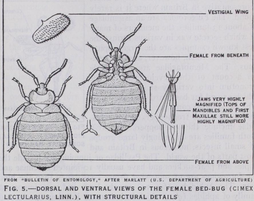 By far the greater number of Hemiptera live and feed upon vegetation : a relatively small proportion suck the body-fluids of other insects or the blood of mammals and birds. The vegetable feeders may live on any part of a plant: aphides tend to congregate on the young sappy shoots, while a few live at the roots: scale-insects often heavily infest the bark, but there are many other kinds found on the leaves and fruit and some on the roots, while leafhoppers and frog-hoppers are abundant on almost all kinds of vegetation. A few species of aphides, scale-insects and Psyllidae form galls but the habit is rare within the order. The carnivorous members mostly prey upon other forms of insect life and this habit is characteristic of the family Reduviidae and of most of the water-bugs : some of the large species of the latter also attack tadpoles and small fish. Other of the carnivorous bugs subsist upon the blood of verte brates. Members of the genus Triatoma (Reduviidae) are vora cious blood-suckers in the Tropics and the species T. megista is the main carrier of the Trypanosome of a fatal human disease in South America. The bed-bugs (Cimex) infest man in most parts of the world where he is living under unhygienic conditions, while certain other members of the same family suck the blood of birds. Members of the curious tropical family Polyctenidae in clude about 20 species of wingless insects, which live deep down among the fur and suck the blood of bats : they are also remark able in being viviparous, the young being brought forth relatively advanced in development.