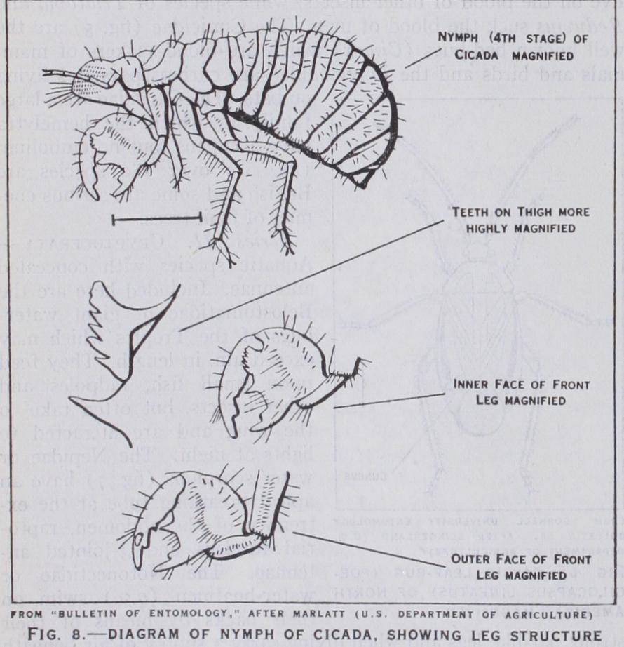 In most Hemiptera the nymphs resemble the parents except for the absence of wings and they are active through all stages of growth, feeding in a manner similar to the adults. The number of moults undergone is very variable and the wing-rudiments appear among Heteroptera about the fourth instar (fig. 13) . Cicadas are remarkable because the young insects are adapted for burrowing, and suck the sap from roots, while the adults are aerial. In male Coccidae an incipient pupal stage is passed through (fig. 14) and the same occurs in both sexes of Aleurodidae : these families, therefore, afford a transition towards insects with complete metamorphosis. Most Heteroptera in temperate countries appear to be single-brooded, but among Homoptera the rate of reproduction is often extra ordinarily rapid, which is an important factor bearing upon the injurious nature of many of the species. The estimates of Reau mur and Huxley regarding the fecundity of parthenogenetic aphides are well known. Buckton, on the other hand, thinks that they are placed too low and he states that the progeny of a single aphid at the end of 30o days (if all members survived) would be the i 5th power of 210 ! R. C. L. Perkins mentions with regard to leaf-hoppers, that if each hopper lays 5o eggs, and the sexes are about equal in number of individuals, in six generations the progeny of one female would amount at the end of the season to 500,000,000. Fortunately climatic changes, parasites and pred ators collectively maintain the proper balance of such prolific creatures by destroying them in vast numbers.