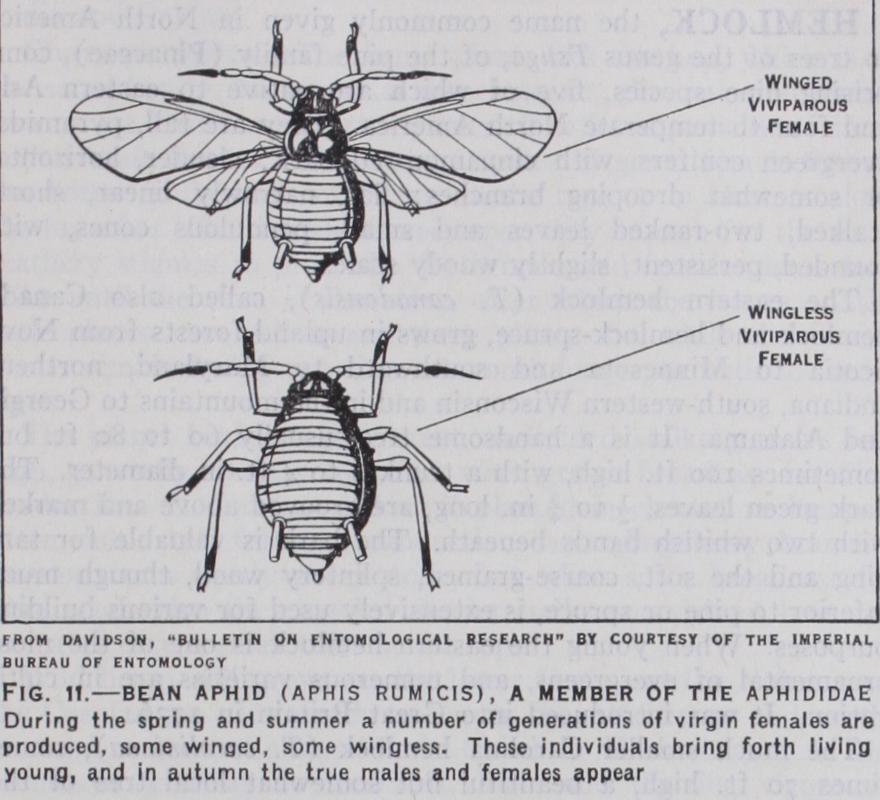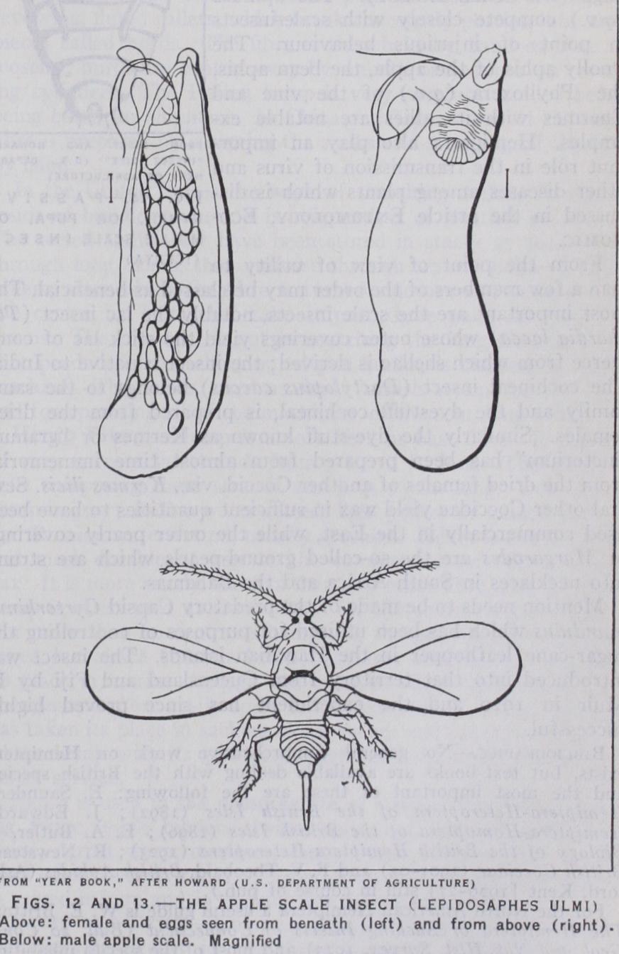 Both families are exceedingly large groups of small insects, numerous in Britain and most parts of the world. The Psyllidae or jumping lice include the apple- and pear-suckers and have usually io-jointed antennae and the fore-wings are of somewhat firmer consistency than the hind pair. The Aphididae (fig. i i) are the large and very important family of aphides (q.v.) which include many injurious species and undergo a highly complex life-cycle: among the best known forms are the woolly aphis of the apple and the vine Phylloxera (q.v.). The Aleurodidae or white flies are minute fragile creatures dusted with a waxy powder: the greenhouse white-fly (Asterochiton vaporarioruyn) is the only species likely to attract notice. The Coccidae (fig. i 2) form one of most noxious groups of all insects and include the scale insects (q.v.) and mealy bugs. The females are degenerate wingless insects and cause most of the damage entailed by this family, while the males are very fragile creatures with a single pair of wings and no mouth-parts.