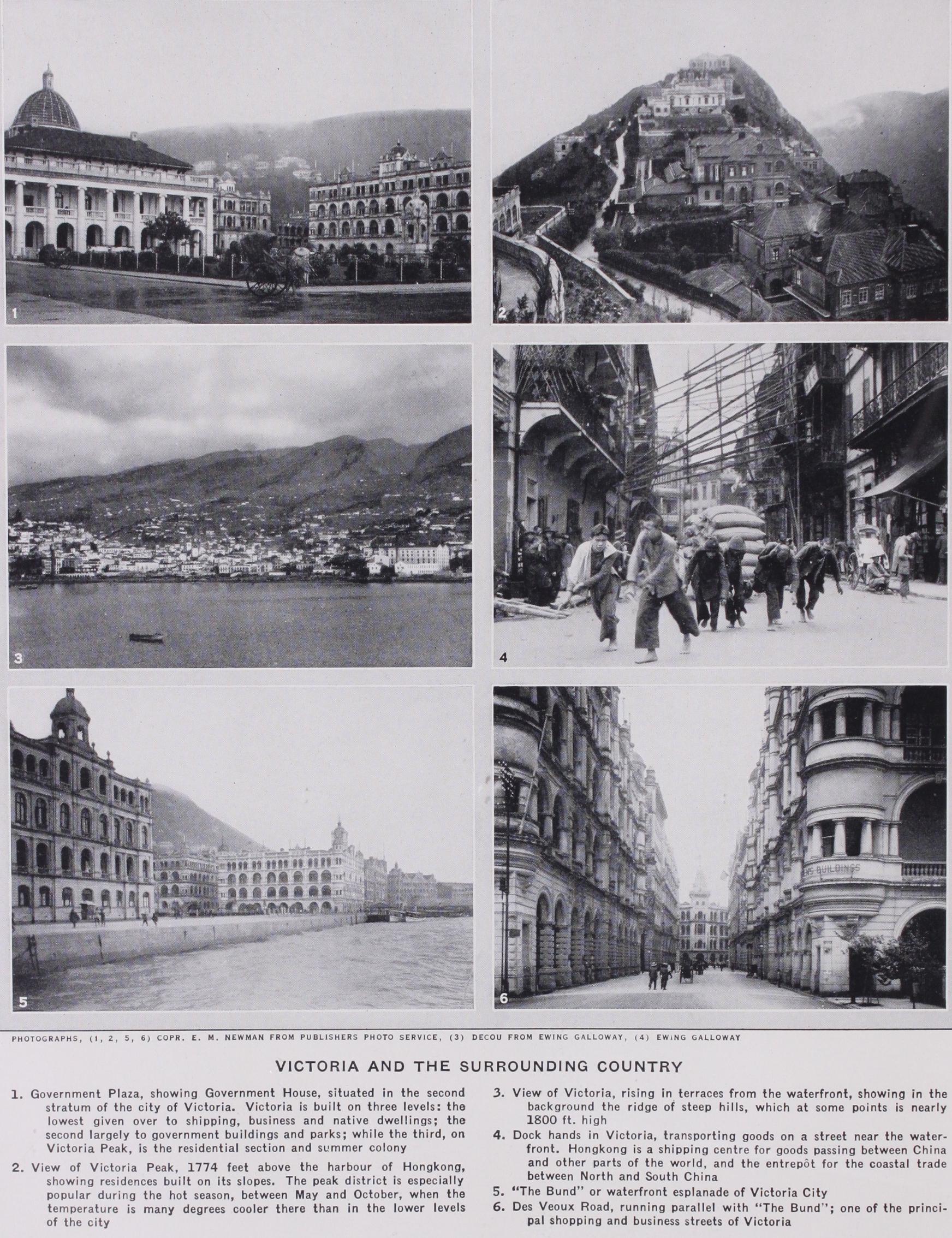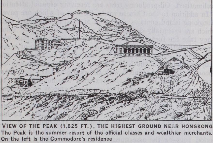 Hongkong island, a detached fragment of the South China massif, is chiefly composed of primary rocks, of which granite occupies about half the total area and forms the basis of the struc ture. The main topographical features of the whole group of islands are largely due to two sets of fracture-lines trending N.E.—S.W. and N.W.—S.E. As a result, the coasts are extremely broken and provide a number of splendid natural harbours. The chief physical feature of the island is an E.—W. range of steep conical hills which rise some 1,500 ft. above the basal plateau, very little of which is suitable for cultivation. Victoria Peak (I,774') in the north-west and immediately south-west of the capital, is the highest point. From the sea, and especially from the fine harbour which fronts the capital, the general aspect of the city rising in hill-side terraces, is very attractive.