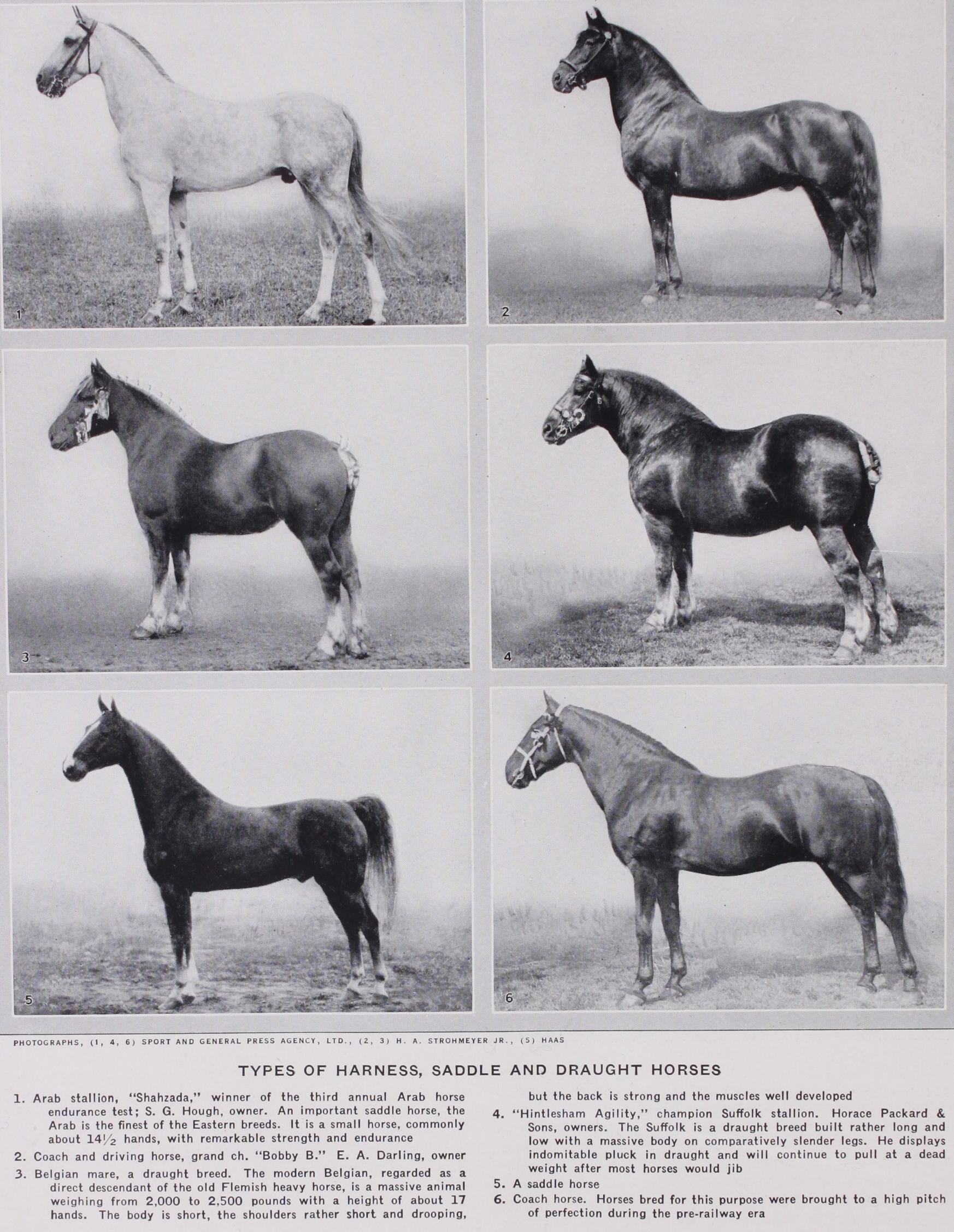 Harness Breeds.—Harness horses may be divided into two main types. On the one hand are breeds like the Hackney, the Yorkshire Coach, the Hanoverian and the Oldenburg, of consider able weight and strength and generally with high and stylish ac tion ; on the other hand, there is the light roadster type, repre sented by the American Standard Bred, in the breeding of which the main emphasis has always been placed on speed. The Hackney originated in the eastern counties of England during the period about 1800 ; an old local trotting breed, which formed the basis, being improved by the infusion of Thoroughbred blood. The Hackney was brought to a high pitch of perfection, as a strong and fast coacher, during the pre-railway era. Thereafter increas ing attention was paid to symmetry and to stylish action and the breed supplied most of the fashionable high stepping carriage horses of Victorian days, but with the advent of the motor-car it lost a good deal of its commercial importance. The Hackney is a horse of 15 or 16 hands in height, with sloping shoulders, some what rounded quarters and hard, clean legs. The chief gait is the trot, in which considerable speed is combined with high knee and hock action. The Yorkshire Coach and Cleveland Bay are related breeds, somewhat taller and stronger than the Hackney, and with less extravagant action. The former is lighter in build and shows more Thoroughbred influence than the latter. The Cleveland Bay is indeed stout enough to be used for ordinary farm work ; crossed with a Thoroughbred of suitable type it often produces an ex cellent weight-carrying hunter. The American Standard Bred, like many other breeds of light horses, owes a good deal to the English Thoroughbred; it has, however, been bred all along to trot or pace rather than to gallop. In the trot the legs are moved in diagonal pairs, i.e., the right f ore and left hind feet leave and meet the ground simultaneously. In the pace the two legs on the same side move together, as in a trotting camel. Most Standard Bred horses show a natural preference for one of these gaits, but can be easily trained to the other. Trotting and pacing matches run in "sulkies" and on hard cinder tracks have long been the popular form of racing in the United States. The speed attained is, of course, less than that reached by a galloping Thoroughbred, but is nevertheless very fast. The trotting record for the mile is just under 2min., and the pacing record is nearly 5sec. less. Saddle Horses.—The most highly improved of the world's saddle horses are probably the English Hunter, the Arab and the American Gaited Saddle horse. The Hunter is a type rather than a breed. Many horses that are ridden to hounds are "clean bred," that is to say Thoroughbred. Others are the progeny of light cart or Cleveland Bay or half-bred or hunter mares by Thoroughbred sires, while others are of Hunter blood on both sides. Where, as is usual, a Thoroughbred sire is used for hunter breeding it is im portant that he be of large bone, short legged and with plenty of substance. The long-legged and "weedy" type of horse that is often successful as a flat racer is useless as a sire of commercial saddle horses, at least of those of the more valuble weight-carry ing type. A good hunter must be able to show a fair turn of speed, must have strength and endurance enough to carry his rider for a long day across country, and should be comfortable to ride and easy to control in any of the four recognized gaits, the walk, trot, canter and gallop. The importance of hunter breed ing is greater than that of hunting, for the bulk of cavalry and other riding horses are of the hunter type and are supplied from the same sources.