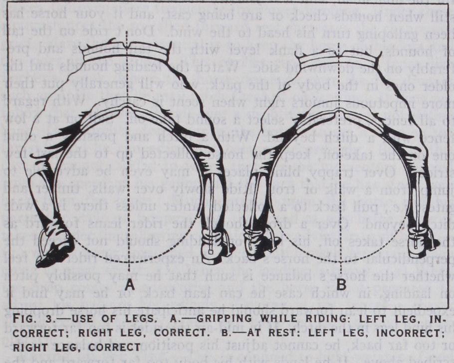 Riding to Hounds.—The seat is the same as for schooling over fences. Good horsemanship is essential for riding a young horse in a hunt. Never jump unnecessary fences, as it is unfair on the farmers and tiring to the horse. Hold your horse together over heavy ground, picking out the best going. Hold a gate open for the huntsman, shut it if you are the last to go through. Stand still when hounds check or are being cast, and if your horse has been galloping turn his head to the wind. Don't ride on the tail of hounds, but to a flank level with the tail hounds and pre ferably on the downwind side. Watch the leading hounds and the older ones in the body of the pack, who will generally put their more impetuous juniors right when scent is catchy. With regard to all fences, preferably select a sound take-off. Sail on at a low fence with a ditch beyond. With a ditch and possibly a .olind one on the take-off, keep the horse collected up to the last few strides. Over blind places it may even be advisable to jump from a walk or trot. Ride slowly over walls, timber and gates; i.e., pull back to a collected canter unless there is a wide ditch beyond. Over a drop, though the rider leans forward as the horse takes off, his body on landing should not exceed the perpendicular to the horse's back. An experienced rider can feel whether the horse's balance is such that he may possibly pitch on landing, in which case he can lean back, or he may find it expedient to lean forward should he anticipate his horse dropping his hind legs in the ditch. If in mid-air the rider is too far forward or too far back, he cannot adjust his position and balance as de scribed above. If he lands with his body too far forward and the horse overjumps and pecks badly, the rider's weight is thrown forward of the horse's centre of gravity and both will come to grief. The horse must have freedom of his head to stretch his fore-legs over a wide place or to save himself if he has blundered on landing. Certainly the rider cannot keep him on his legs by holding him up with the reins. A horse that stumbles can be held together to prevent this, but when he has actually stumbled badly, freedom of his head admits a reasonable chance of re covery. Banks are encountered in many countries. They may have a ditch on one or both sides and may be crowned with a hedge. Invariably they should be ridden at slowly to prevent the horse attempting to fly them, and at the same time giving him time to change his legs at the top. He requires a free head to alternate his change of balance when negotiating banks. A line of pollards indicates the presence of a brook. If the hounds at tempt to jump it, it is safe to as sume that the horse can clear it.