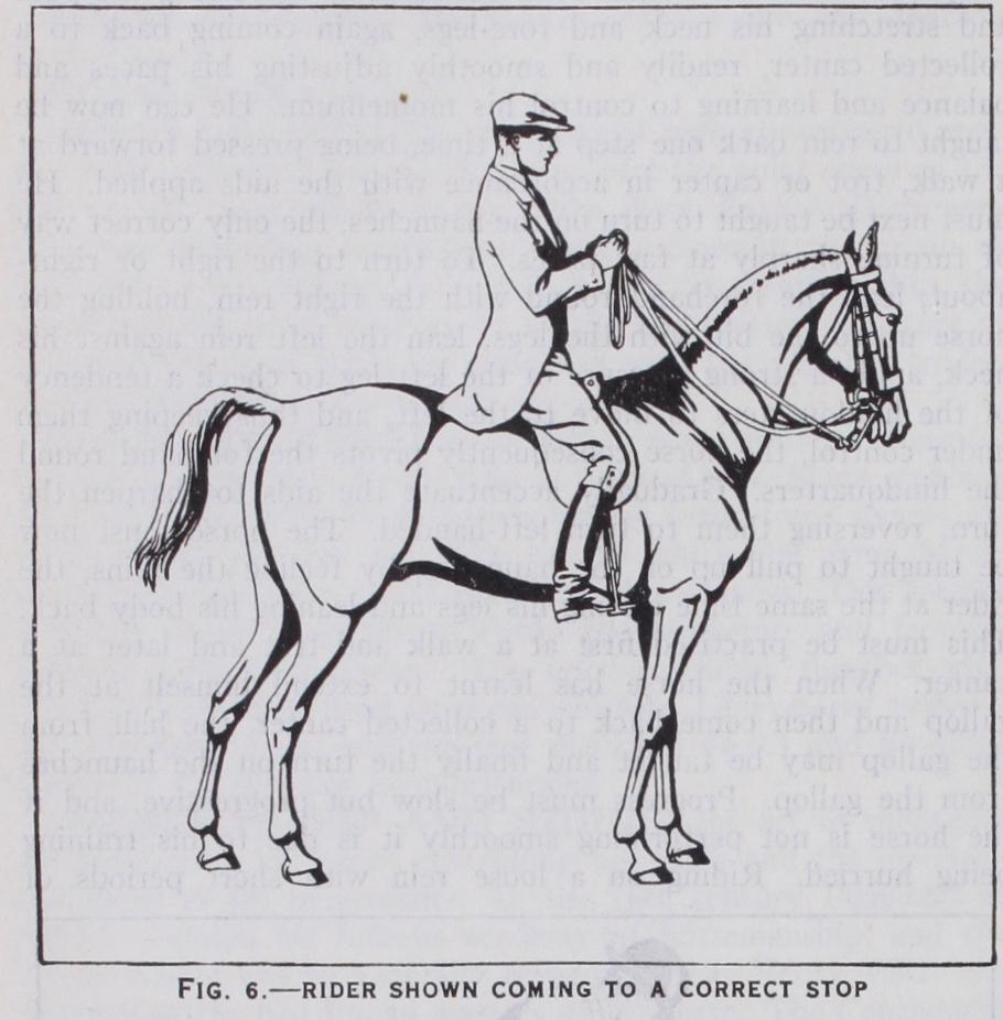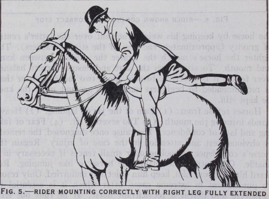 Schooling over Fences.—First lessons may be confined to jumping free in a lane, using a trained horse as a leader, or the youngster may be led in hand over small obstacles. Training must be progressive over small but solid fences and ditches. Later, when mounted, the rider should approach the fence at a collected canter with the reins in both hands. Three lengths from the fence lower the hands, still maintaining contact with the horse's mouth. Unless the horse is a naturally free jumper, close the legs to retain impulsion and to keep the horse's hocks under him. The rider should be sitting upright ready to lean for ward as the horse takes off, his own weight being borne on the knees, thighs and stirrups, the leg below the knee being free to drive on the horse. As the latter raises his forehand, the rider inclines his body forward, his weight being approximately over the horse's centre of gravity. He must be prepared in mid-air to give the horse more rein which the latter will require on landing. If the rider is leaning back at this period, he will upset the horse's balance and when jumping slowly he is liable to give the horse a chuck in the mouth as he is thrown back himself. This is known as the horse "jumping away" from his rider as opposed to the rider "going with" his horse. Schooling a youngster over simple fences the rider need not attempt to lean back. He can best assist the horse by keeping his weight constant over the latter's centre of gravity (approximately the dees of the stirrup leathers). The lighter the horse's mouth the lighter the contact between hand and mouth. To strengthen the seat and ensure correct balance over fences it is advisable to ride about two inches shorter than is recommended to beginners and on no account must the knee be kept stiff.