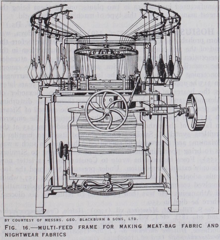 Fig. 16 gives a view of what is known as the multi-feed frame, which is provided with latch needles and is set to give a colossal production of fabric, in fact the multi-feed knitting machine ranks as the fastest textile-producing machine in existence. It owes its high speed to the circular principle of construction, which provides for a large number of stitching-forming units being housed round the circle. They f ol low each other in close succession right round, so that in the large diameter machines 8o feeds are arranged, which means that for every revolution of the needle cylinder 8o courses of loops are inserted, and if there are to courses of such loops per inch, this gives 8 in. of fabric at each turn of the cylinder. If there are i o cylinder revolutions per minute, this gives 8o in. of fabric produced per minute, and allowing for stoppages this would yield about 2 yd. per minute. Naturally, with such a large number of stitch-producing setts round the circle the texture is not of the most regular description, but such gauzy fabric is useful for many purposes, notably for meat bags in which the carcases of animals are wrapped for transport, particularly in connection with the meat-packing trade. In lesser number of feeds than described above it is also a machine well adapted for the football jersey trade where bold cross stripes are required, and the threads are ar ranged in due colour order on the machine platform.