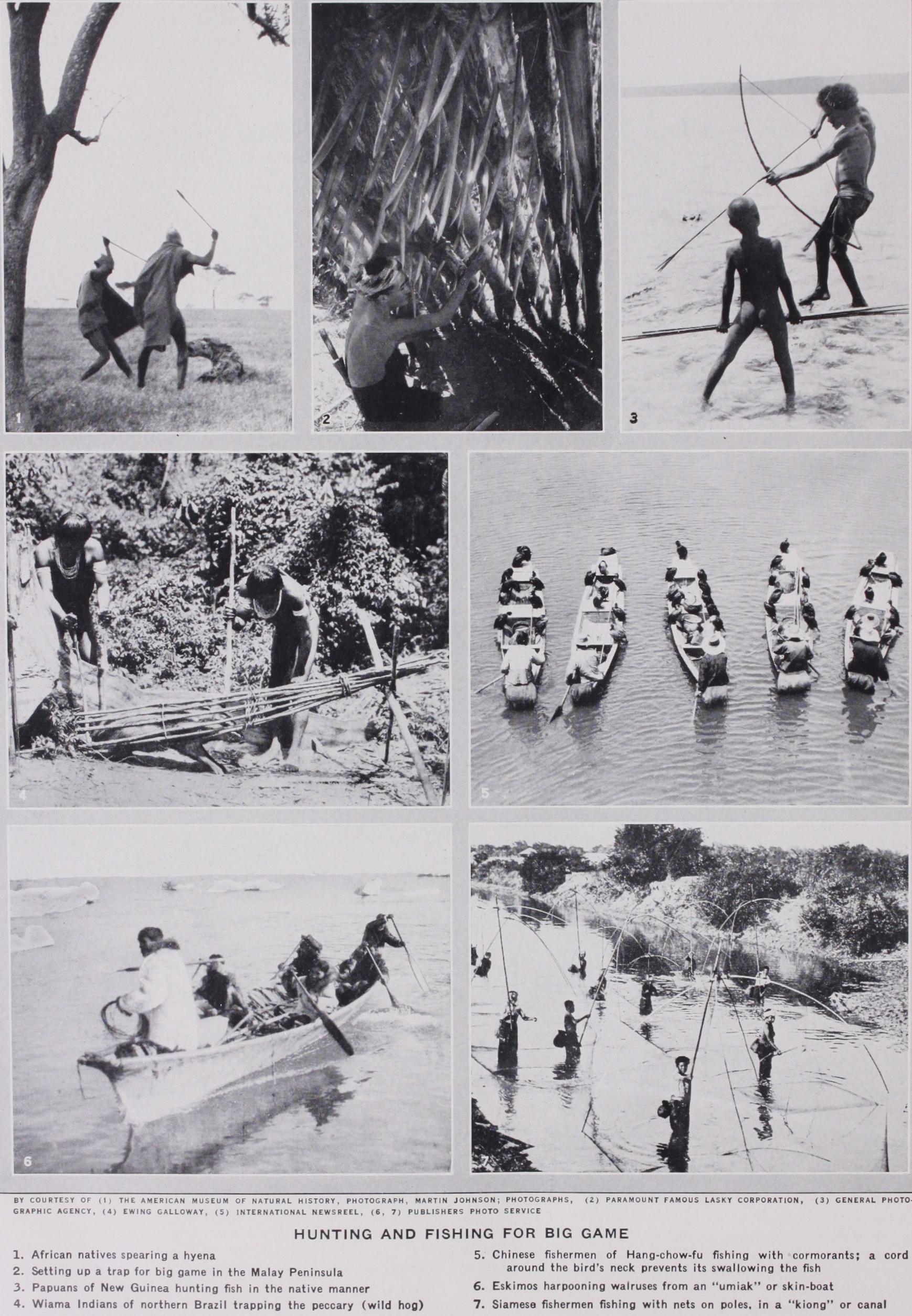 At the present day hunting peoples, together with the game on which they depend, are being encroached upon and crowded out by pastoral or agricultural peoples. When hunters can no longer shift their hunting grounds, when game diminishes or disappears, they must find some other food supply or die. As a purely hunting group they cease to exist. They may be actually exterminated, like the Tasmanians, and, to a large extent, the Bushmen of South Africa ; they may be artificially protected and preserved, like the Amerinds of North America, and the Aus tralians ; they may survive with the help of agriculture, like many central African peoples; or augment their living by trade, like many of the Eskimo groups. But in their original state hunting peoples are now found only in unsettled districts, in areas too barren, remote, unhealthy or otherwise unattractive for settlers. In Africa the equatorial forest region preserves its pygmies and marginal Bantu hunters, the barren semi-desert of the Kalahari its scanty tribes of Bushmen, and sporadic groups of hunting peoples are found in isolated patches such as the Bauchi highlands of Nigeria and elsewhere. In the tundra region of Asia, animals are hunted as much for fur as for food, and the general use of fire arms raises the hunting above the primitive level ; but to the east, the Ainu in northern Yezo and the Kuriles still shoot with small bows and poisoned arrows and maintain themselves by fishing and hunting. In the south of the continent the forested and hilly parts of Ceylon shelter the Vedda, and the jungles of southern India contain tribes such as the Kadir of the Anaimalai hills and the Kurumba of the Nilgiris. Further to the east the isolated Anda man islands, the thick jungle of the Malay peninsula, and neigh bouring islands, and parts of the Philippines all contain primitive hunters and collectors, as do the open arid plains of Australia. In North America the Eskimo, a typical hunting and fishing people, fringe the north coast and its islands and the easternmost end of Asia ; on the north-west coast the Salish, Nootka, Tshimshian and other tribes, live in one of the best hunting grounds of the world, between the mountains and the sea. The caribou and other deer in the tundra and northern plains, and bison in incredible herds in the heart of the continent (from the upper waters of the Saskatchewan to the Gulf of Mexico) maintained hunting tribes until the coming of the whites. In South America the river basins of the Guianas and the Amazon are still occupied by little-known hunting tribes, usually partly dependent on cassava made from manioc. To the south, from the interior of the Argentine to the Horn is more or less open country where the guanaco (wild llama) was abundant, and, with smaller game and fish, supported nomadic hunters. In this area the Spaniards introduced cattle, which ran wild over the plains, and wild horses, to be trained to follow in pursuit. Some of the Gran Chaco hunters cultivated a little maize but this was unknown to the Patagonians, and in the extreme south the Fuegians, like the Eskimo, depend more on sea produce than on land.