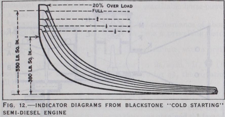 This is very well illustrated by fig. 12, which is a reproduction of diagrams taken from a i so B.H.P. Blackstone cold starting heavy oil engine. It will be observed that the maximum com pression pressure was 38o lb./sq.in., while the maximum explosion pressure was 55o lb./sq.in. at full load, and that combustion continued constant at this maximum explosion pressure for a short portion of the working stroke.