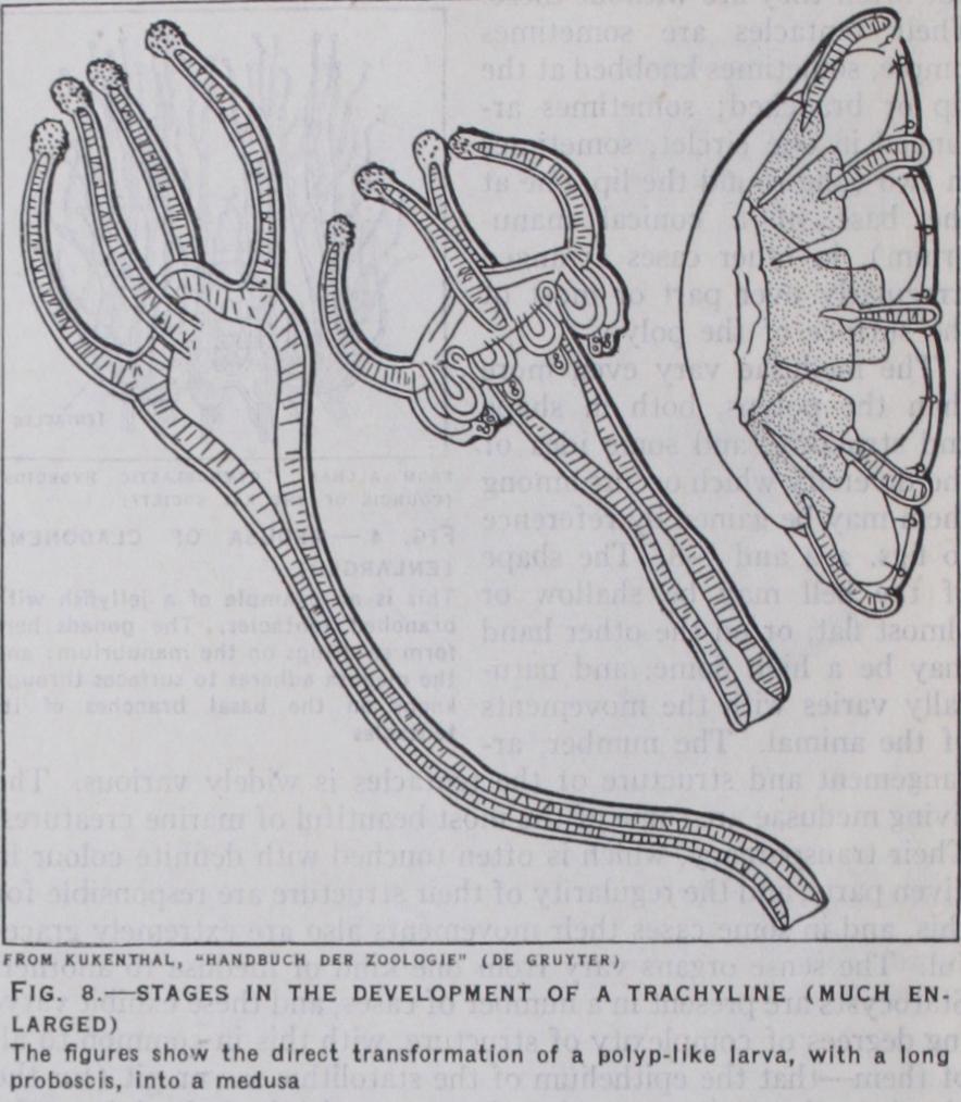 Diversities Exhibited by the Polyps and Medusae.—We may now pass on to some of the interesting diversities which the polyps and medusae exhibit. To begin with, in certain colonies, such as those of Millepora and Hydractinia (fig. 7), the hy dranths are not all alike. Some of them (gastrozooids) possess mouths as well as tentacles, and inside these polyps digestion of food takes place. Other polyps on the contrary possess no mouths, but may have tentacles and are well provided with stinging capsules such as are described in the article COELEN TERATA. These polyps themselves cannot feed, but they play a defensive part in the colony and assist the others in the capture and paralysing of food; they are known as This is a simple example of the phenomenon of polymorphism, which has been previously mentioned and which will be further dis cussed later. It is carried to greater lengths in Hydractinia than in hiillepora, since in this case the colony produces also blasto styles similar in principle to those of Obelia. These may be re garded as modified polyps with a body but without mouth or tentacles, which produce sexual buds. Therefore a Hydractinia colony possesses four kinds of individuals—gastrozooids, dactylo zooids. blastostyles and sexual buds.