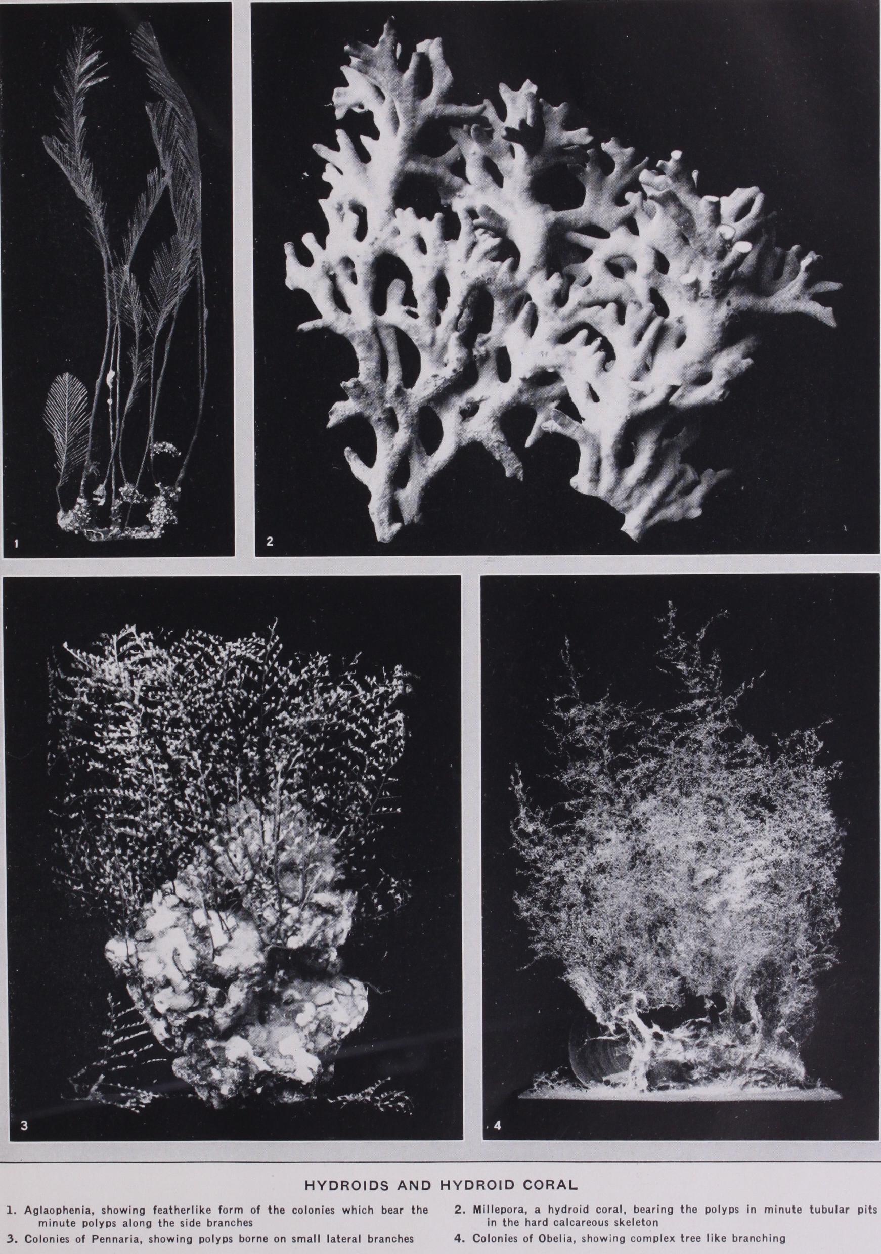 These massive forms deserve special mention. They have been considered in time past as a separate group of Hydrozoa, the Hydrocorallina; but it has become evident that they are simply Hydroids with a more than usually solid skeleton, and that some of them are probably related to one series of Hydroid ancestors, others to a different series. A good example of these creatures is found in Millepora (see Plate). This animal constructs a colony containing innumerable minute individual polyps, which are connected with each other by a continuous surface-sheet of ectoderm and by a network of ramifying tubular rootlets. The colony secretes a massive, limy skeleton which may become a foot or more in height, and which is branched somewhat like the antlers of a stag, but in more compact fashion. The polyps inhabit little pits in the surface of the skeleton, and can retire into these com pletely when alarmed. The network of rootlets is lodged in a network of canals in the surface layers of the skeleton, the deeper parts consisting of coral only and containing no soft parts; this internal portion was secreted by the soft parts originally, but as growth proceeded and further skeleton was formed, these retired to the surface-layers. One can imagine that a similar state of affairs would be produced if a colony such as that of Clathrozoon were to secrete limy material into the meshes between its net work of rootlets. Millepora is extraordinarily interesting in one respect. When the time comes for sexual medusae to be pro duced by the colony, these are not formed from buds as in Obelia and other Hydroids. Instead the sex-cells, which are migratory, move from the rootlets into one or other of the polyps. Each polyp so affected loses under their influence its characteristic structure, and becomes trans formed by degrees into a medusa.