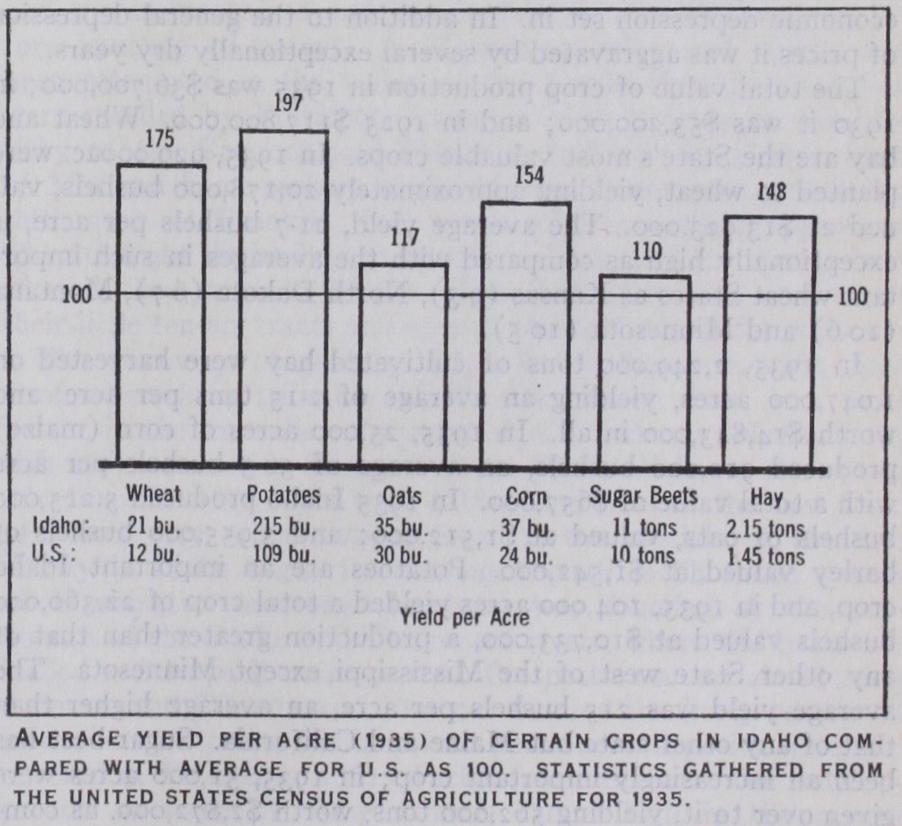 In 1935, 2, 249,00o tons of cultivated hay were harvested on I,o47,00o acres, yielding an average of 2.15 tons per acre, and worth $14,843,00o in all. In 1935, 25,00o acres of corn (maize) produced 912,00o bushels, an average of 36.5 bushels per acre with a total value of $657,000. In 1935 Idaho produced 5,215,000 bushels of oats, valued at $I,512,000; and bushels of barley valued at $I,S42,000. Potatoes are an important Idaho crop, and in 1935, Io4,000 acres yielded a total crop of 22,360,000 bushels valued at $Io,733,000, a production greater than that of any other State west of the Mississippi except Minnesota. The average yield was 215 bushels per acre, an average higher than that of any other state but Maine and California. Sugar-beet has been an increasingly important crop; in 1935, 51,00o acres were given over to it, yielding 562,00o tons, worth $2,87 2,000, as com pared with 38,00o acres in 1925, yielding 486,00o tons worth $3,027,000. These statistics do not include the benefit payments or government purchases of farm crops by the Agricultural Ad justment Administration. A total of $13,938,867 was reported paid to Idaho fanners by the Agricultural Adjustment Administration from May 1933, when the bureau began functioning to June 1936 when it ceased.