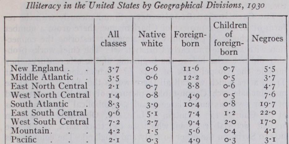 Unfortunately statistics of illiteracy are not collected in a uniform manner in various countries, nor do given figures repre sent the same age groups, so that much of their value for com parative purposes is lost. To intelligently reveal conditions illiteracy should also be classified as to sex, nationality and race. Only the first is possible in the table given below. Norway, Sweden, Germany and Switzerland claim a negligible amount of illiteracy. Germany ceased keeping statistics in 1913 when her male percentage as revealed by army recruits was .05. Illiteracy statistics for Great Britain were based upon the proportion of those signing their names in the marriage register with a mark, but even these ceased to be included in the Registrar-general's annual report in 1914 when the percentages stood at o.8% for males and 1.0% for females. In 1841-45 the figures had been 32.6% and 48.9% respectively. For other important countries the percentages are given in the following table :— Illiteracy statistics are most complete in the United States. (See UNITED STATES : Population and Social Conditions.) The comparatively high percentage of illiteracy there where education is compulsory was due chiefly to the adult negro and foreign-born populations. The illiteracy of native whites in 1930 was 2.7%, of foreign-born whites 9.9%, of children of foreign parents o.6% and of negroes 16.3%. The low percentage of illiteracy among children of the foreign-born reveals how eagerly the for eign-born take advantage of free education. Negro illiteracy was reduced from 30.4 in 1910 to 16.3% in 1930. The illiteracy among native whites was found chiefly in the isolated rural districts of the older states and in the newer states where the demands of the frontier had prevented an older generation from receiving their educational inheritance. Illiterates among arriving immigrants decreased from 23.5% in 1900-09 to o.9% in 1926 due to new immigration laws.