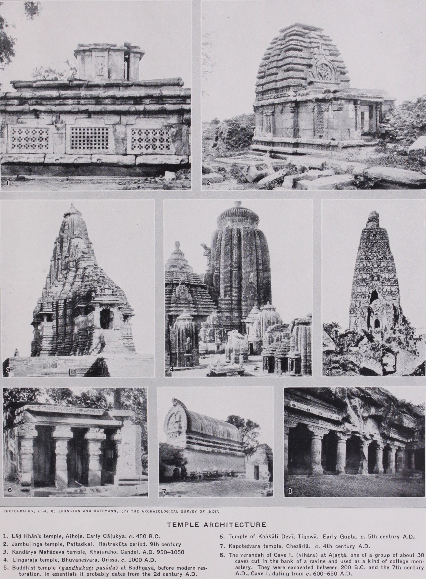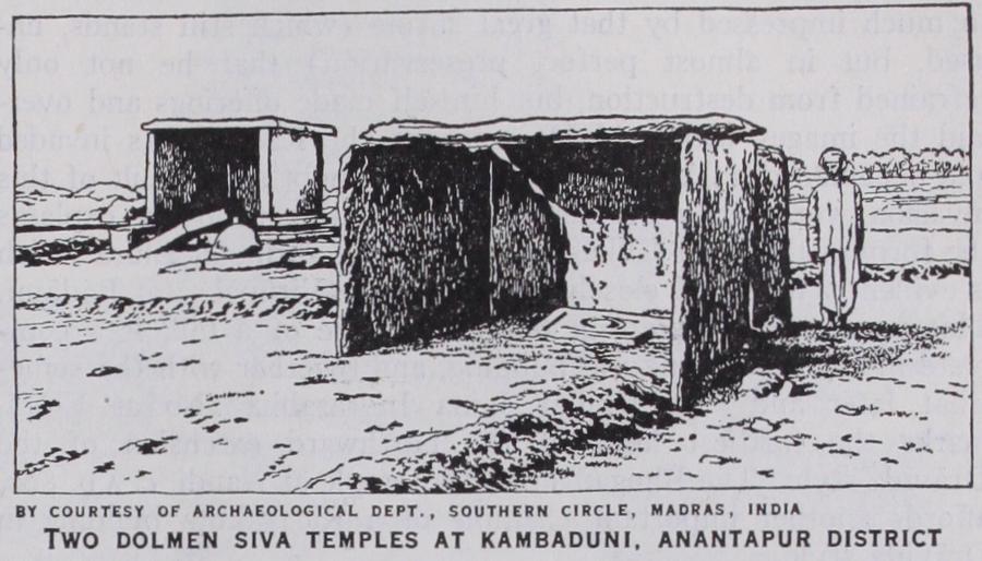 INDIAN ARCHITECTURE, like Indian sculpture, is essentially of native origin, belonging to the Dravidian rather than the Aryan race. The Vedic ritual required neither images nor temples, but the non-Vedic cults, such as those of the dragons (Nagas), the tree-spirits (Yaksas) and the goddesses, may have had permanent shrines with images and wooden temples. Refer ences to images and temples begin to appear in the literature from about the 4th century B.C. onwards, and numerous types are represented in the reliefs from the 2nd century B.C. In Hindu worship (puja, the service of a personal deity with offerings of food, lights, incense, etc., as distinguished from yajna, the Vedic sacrificial ritual) the first essential is an altar, with or without a symbol or image, serving to receive offerings of flowers. Such an altar beneath a sacred tree, for example, constitutes a Yaksa caitya. The term caitya denotes a shrine of any kind, but has often been used (erroneously) to designate exclusively the stupa. The next step is a god's house (devdlaya, devdgdra, dyatana, etc.), a simple roofed enclosure containing the altar and symbol or image.