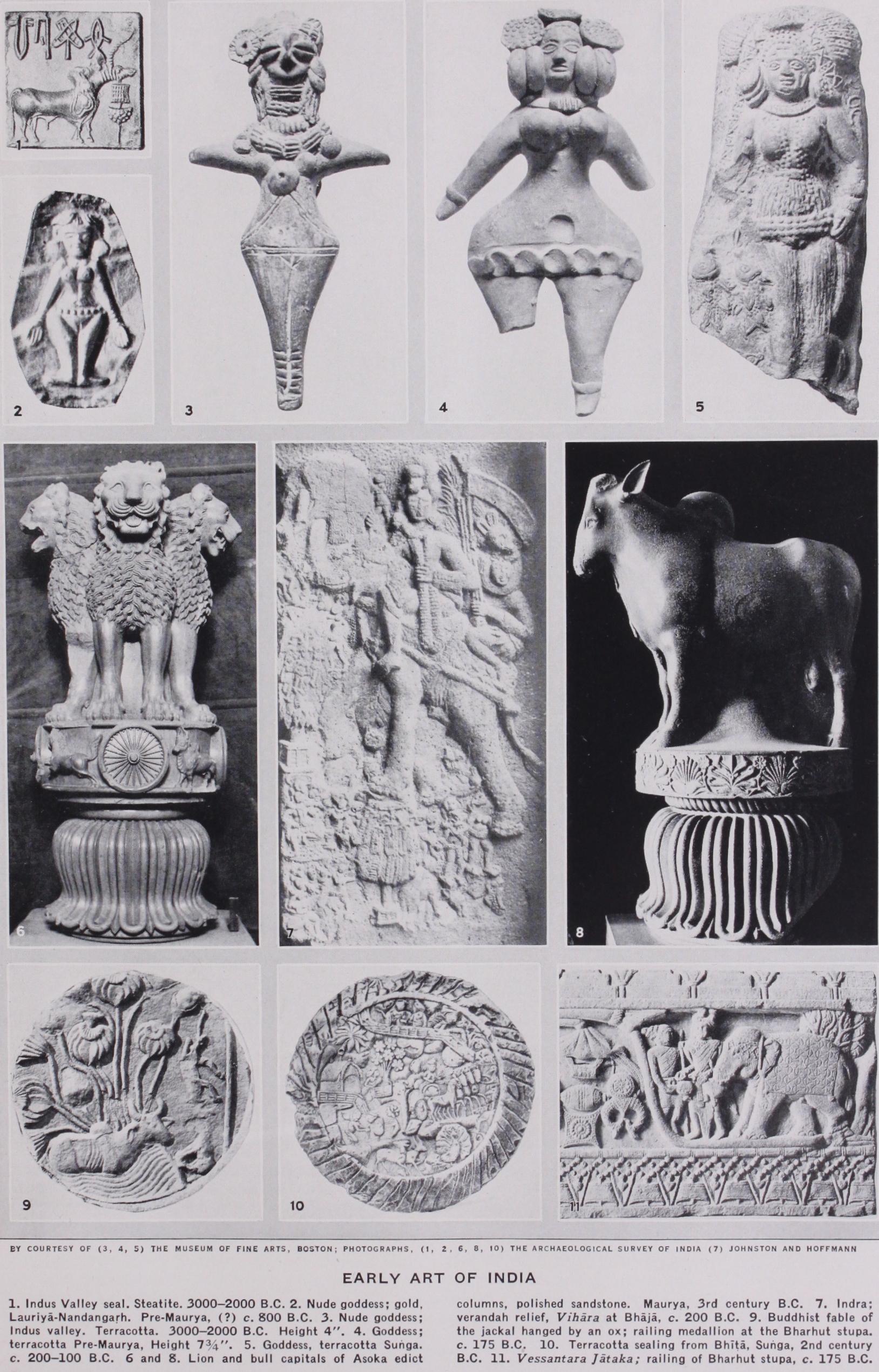 The buildings are of well-burnt brick. Sculptures in alabaster and marble include a painted figure of a man, and a much finer bearded head wearing what looks like a wrought metal skull cap decorated in imitation of hair (fig. 3) ; in terracotta, figurines of a nude goddess with an elaborate headdress, girdle, and the body ornament (channavira) teristic of later Indian art ; in racotta and in faience, admirable figures of animals, including the bull, rhinoceros, dog and cock. All these are sculptures in the round. But the most abundant and not the least remarkable works of art are the square seals of faience or ivory, which bear in relief . figures of animals, usually a bull, elephant or eros, with a cult object, apparently a wicker crib or manger, and pictographic signs, partly related to early Sumerian forms and even more similar to pre-Sumerian forms found at Kish, but so far undecipherable. Some scholars believe that the later Indian Brahmi (Sanskrit) script has been developed from this early pictographic type. One seal bears a seated cross-legged figure tended by snake-hooded Nagas, as in much later, Buddhist, art ; another a sacred tree (the pippala, Ficus religiose, later known as a symbol of various deities, particularly the Buddha) with a horned dragon projecting from the trunk (cf. Ward, Seal Cylin ders of Western Asia, fig. 710) ; another a row of men bearing totem standards like those of predynastic Egypt. One earlier seal from Harappa represents a tiger hunt.